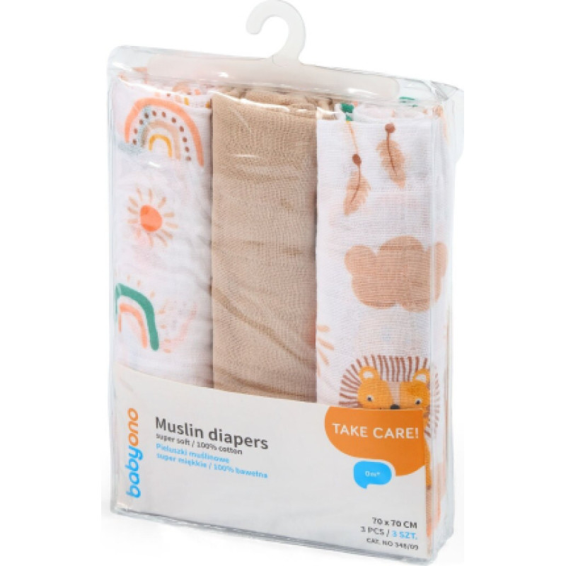 У комплекті 3 пелюшки: одна однотонна та дві з малюнком. Склад - 100% бавовна. Розмір - 70 х 70 см.