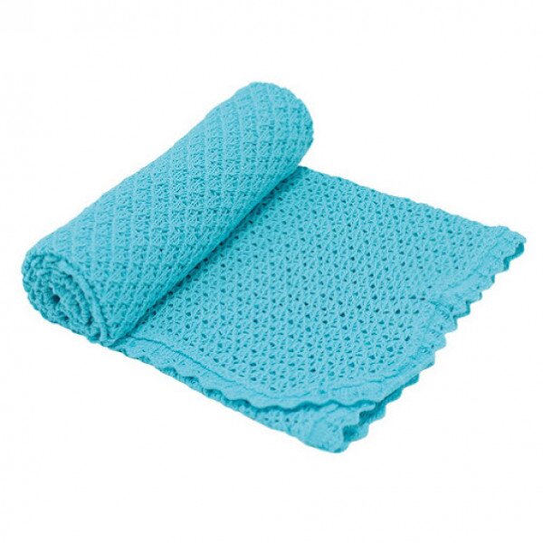 Стильний в'язаний плед у блакитному кольорі підходить для дому та прогулянок на вулиці в колясці в демісезонний та літній період.