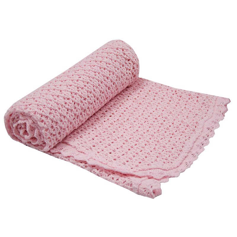 Стильний в'язаний плед у рожевому кольорі підходить для дому та прогулянок на вулиці в колясці в демісезонний та літній період.
