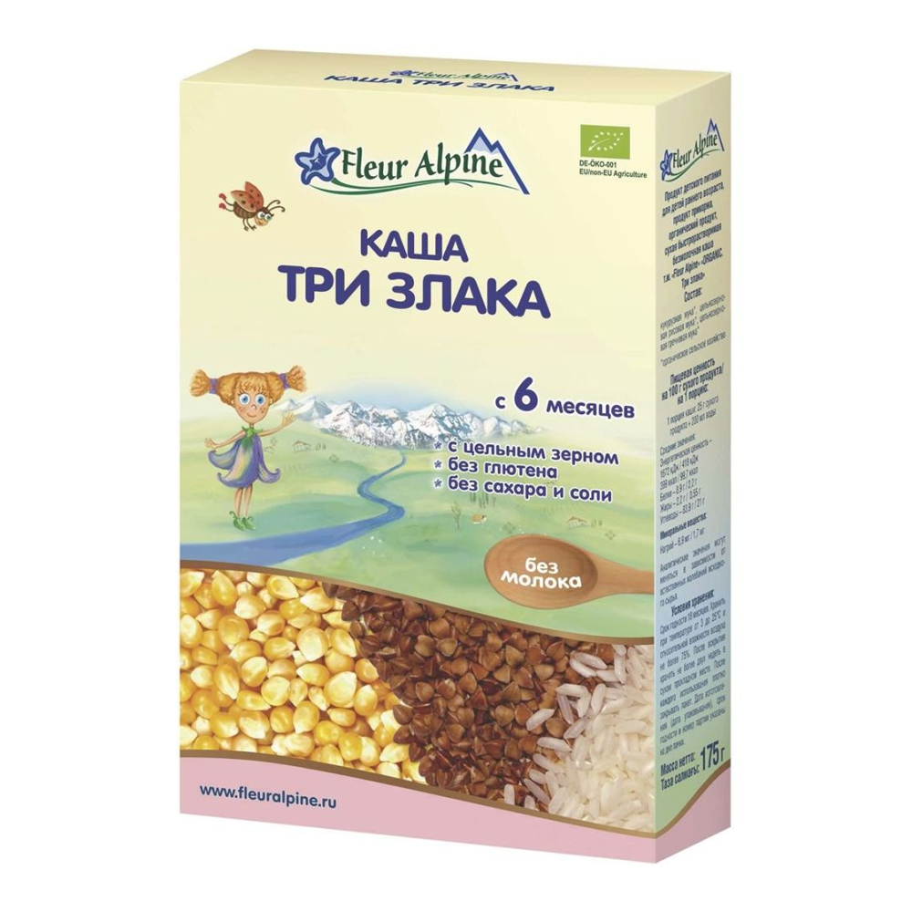 Каша безмолочна Fleur Alpine Три злаки (гречана + кукурудзяна + рисова) для дітей старше 6 місяців. Гіпоалергенність підтверджена клінічними дослідженнями. Без глютену. Не містить слідів молока. Без додавання цукру. Розчиняється легко, швидко і без грудочок.