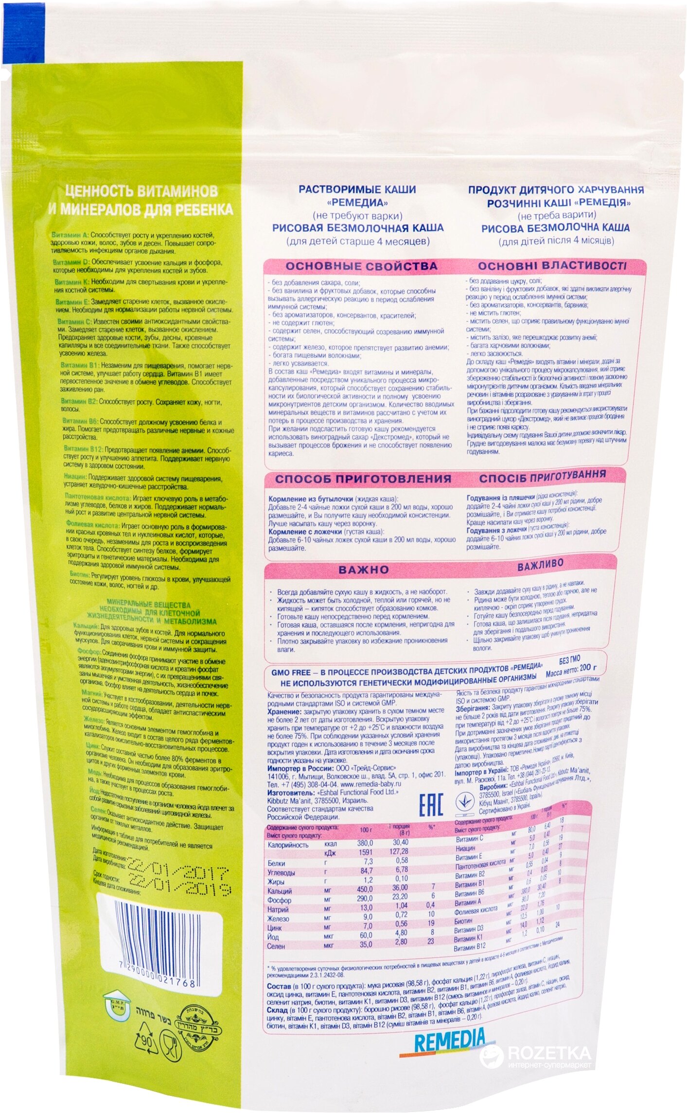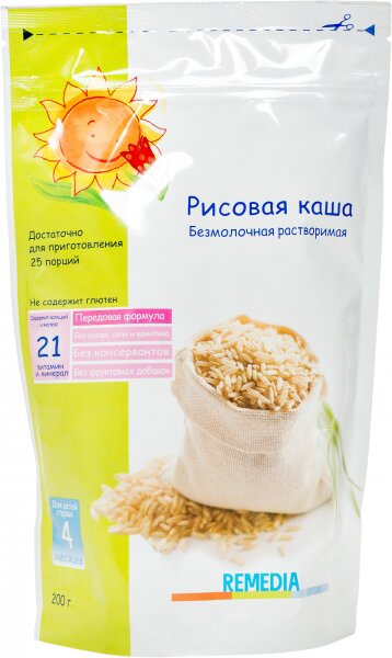 Дитячі каші Remedia виробляються в Ізраїлі із застосуванням сучасних технологій у фармацевтиці та харчовій промисловості. Висока якість і безпека дитячого харчування гарантовані міжнародними стандартами ISO та системою GMP. Каші мають натуральний злаковий смак і запах, оскільки в їх склад входять тільки злакове борошно для дитячого харчування й комплекс вітамінів і мінералів. Тому каші Remedia ідеально підходять для введення як перший прикорм та дітям, схильним до алергії. Гіпоалергенний склад каш повністю виключає додавання молока, цукру, солі, натуральних фруктових і овочевих добавок, а також не містить ванілін, який може викликати алергічну реакцію. Для збагачення каш Remedia використовуються саме ті мікронутрієнти, дефіцит яких є реально, широко поширений і небезпечний для здоров'я дитини.