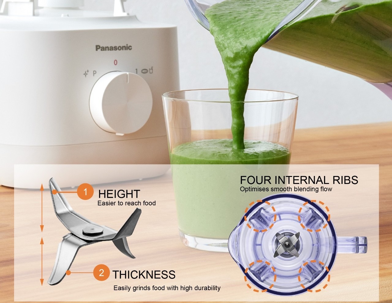 Леза з нержавіючої сталі забезпечують рівномірне перемішування, а чотири внутрішні ребра підтримують консистенцію потоку, рівномірно подрібнюючи інгредієнти.