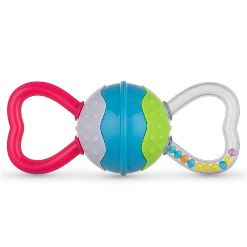 Яскраве брязкальце з поворотним механізмом та рельєфною поверхнею. Зроблене у формі "цукерки" - кульки з двома руків'ями для зручного захоплення маленькими ручками. Усередині є намистинки, що привертають увагу дитини. Іграшка виготовлена з якісного пластику. Для дітей від 3 місяців.