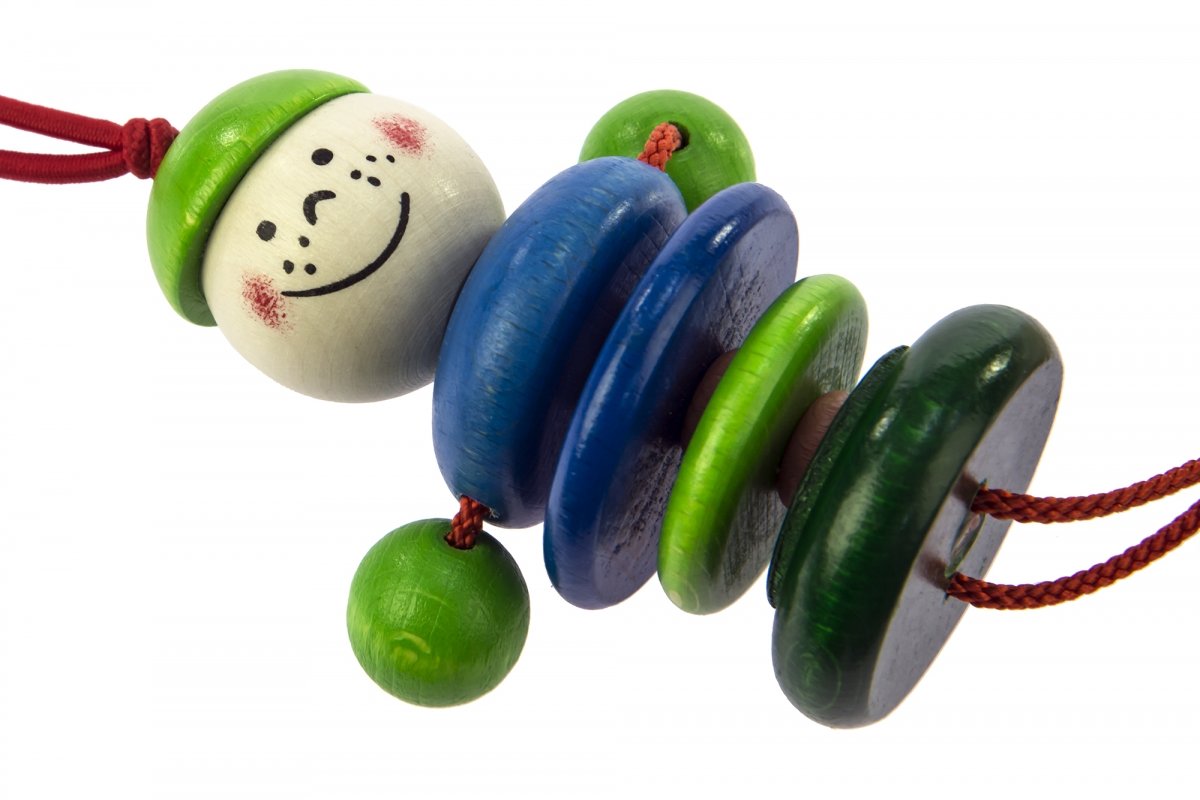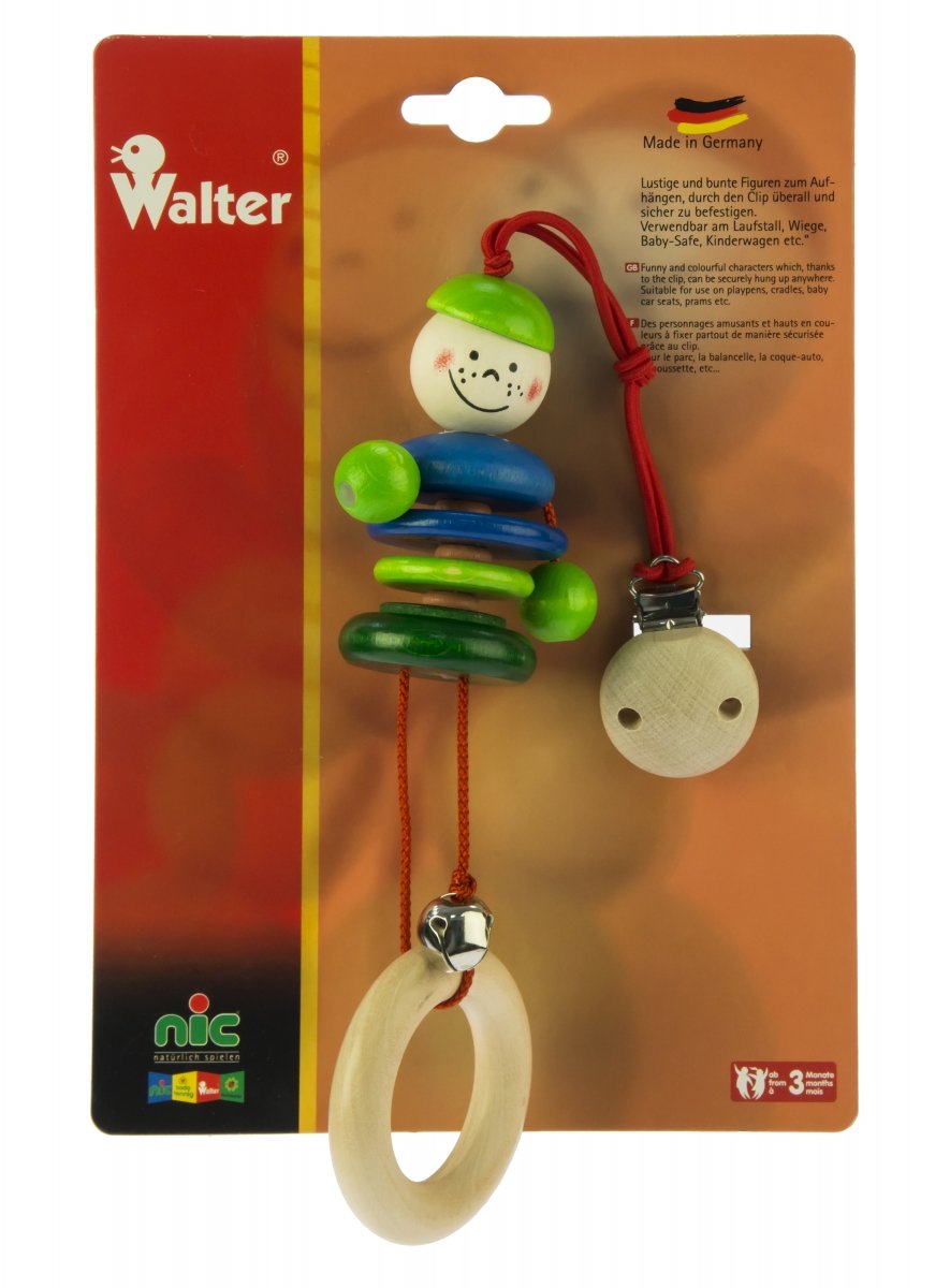 Екологічне брязкальце на кліпсі «Карлі» німецького виробника іграшок nic для дітей від 3-х місяців. Цей аксесуар надійно чіпляється на ліжечко або коляску найменших. Він постачається разом із міцною фірмовою картонкою, на якій закріплена кліпса. Вона вироблена із дерев’яних елементів у натуральних, блакитних та зелених кольорах, гнучких червоних гумок, червоного текстильного шнурка, металевого дзвіночка та надійної металевої кліпси. Дерев’яні елементи оброблені дуже якісно, вони вкриті фарбами на водній основі. Метал, з якого зроблений дзвіночок і кліпса, гіпоалергенний - весь аксесуар в цілому безпечний для здоров’я дитини.
