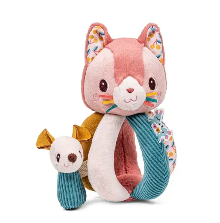 Брязкальце з ручками Lilliputiens Котик Жанетт — це м’яка сенсорна іграшка з безліччю цікавих деталей, яка пробуджує слух, зір і тактильні відчуття малюка вже з 6 місяців.