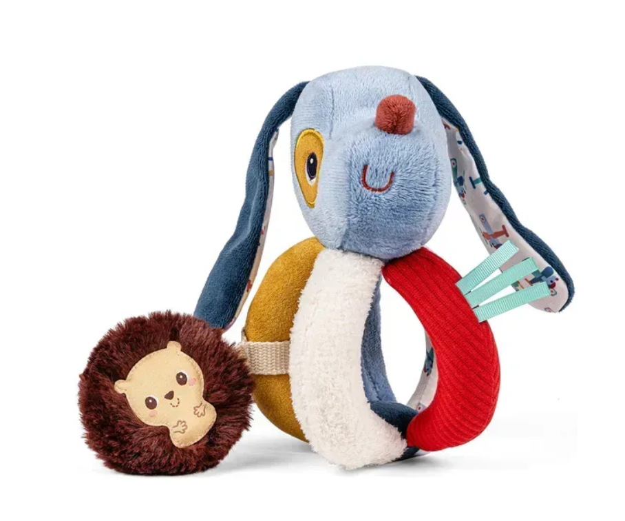 Брязкальце з ручками Lilliputiens Собачка Жюль — це м’яка сенсорна іграшка для малюків від 6 місяців, яка поєднує в собі брязкальце, різні фактури, ручки та прихованого друга — їжачка Леона.