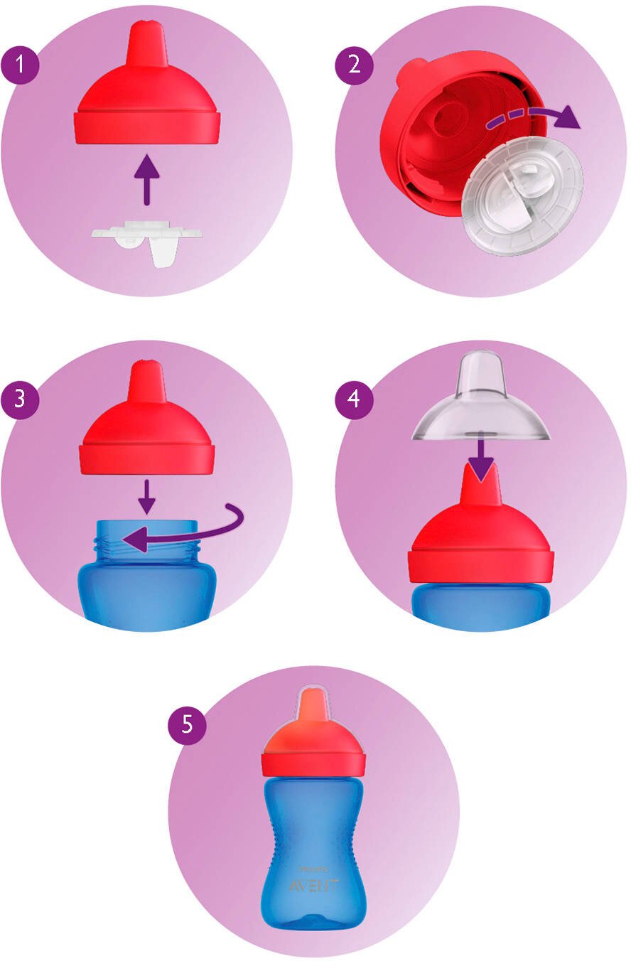 Проста конструкція: легкість збирання й очищення (підходить для миття в посудомийній машині). Чашка Philips Avent з твердим носиком складається всього з декількох елементів, тому її дуже легко зібрати. Захисний ковпачок закриває носик. Всі деталі можна мити у посудомийній машині.