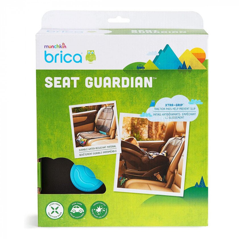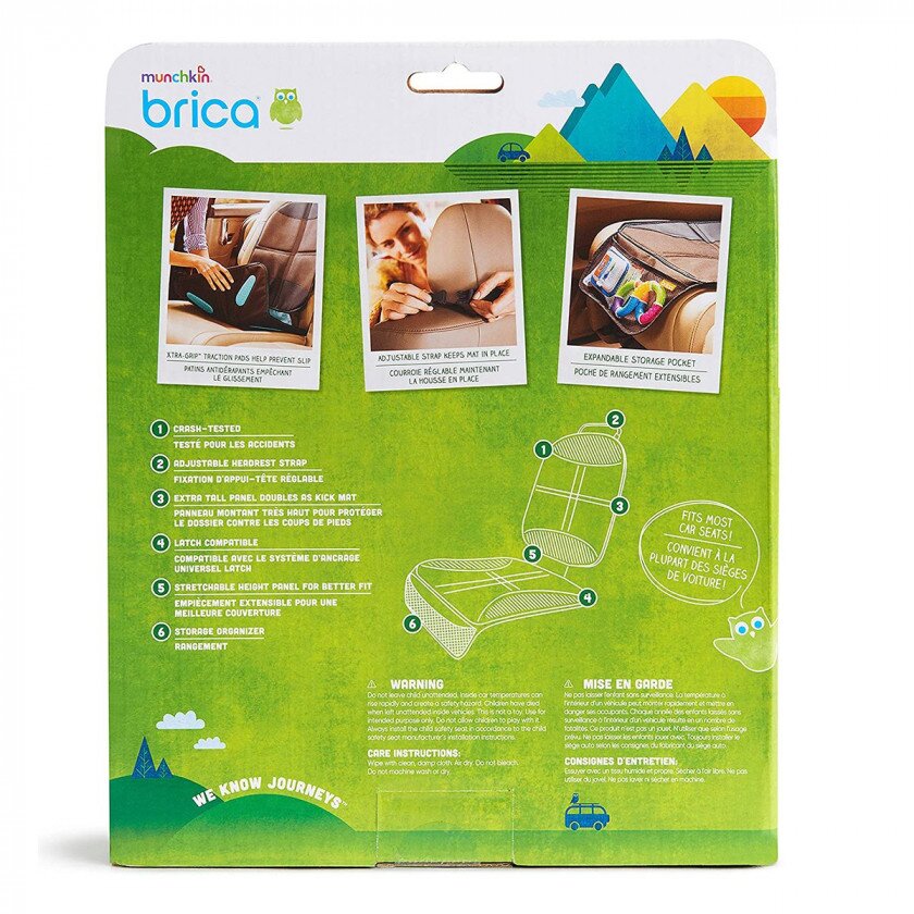 Особливості захисного чохла під автокрісло Brica: текстуроване покриття Xtra-Grip Traction Pads запобігає ковзанню; міцний і водостійкий матеріал; містка кишеня дозволяє тримати під рукою найнеобхідніше; кріплення Seat Guardian утримує чохол на регульованому підголівнику; чохол сумісний з кріпленням в машині Isofix; лаконічний дизайн добре поєднується з будь-яким автокріслом.