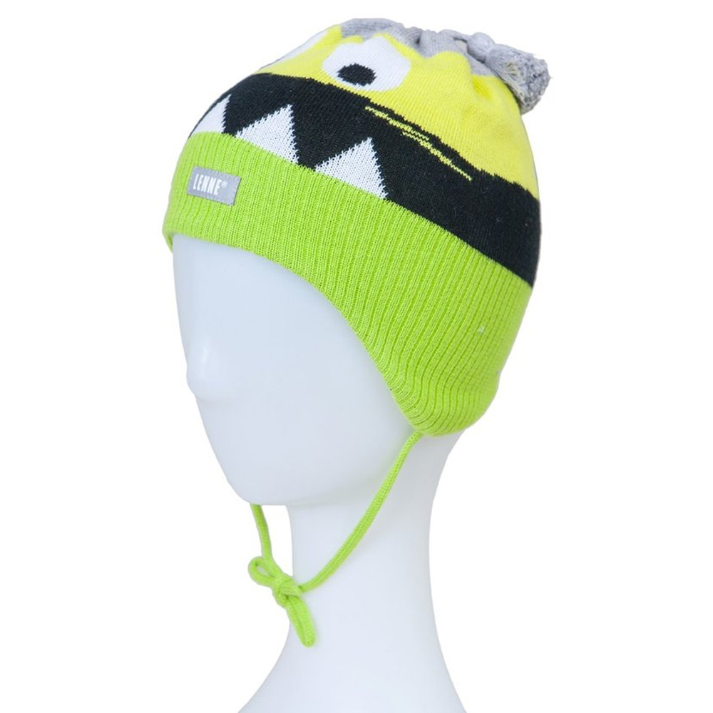 Трикотажна шапка з зав'язками та захистом для вух, прикрашена китицею, для хлопчика 1-2 років. Малюнок - кумедна мордочка. Колір - салатовий з синім. Розмір - 48.