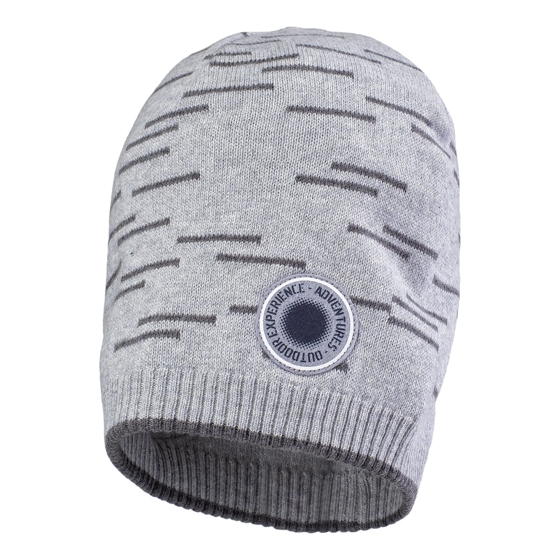 Світло-сіра шапка для хлопчика 7-8 років. Виробництво Естонія. Склад - 100% бавовна. Прикрашена темними смужками, написом.