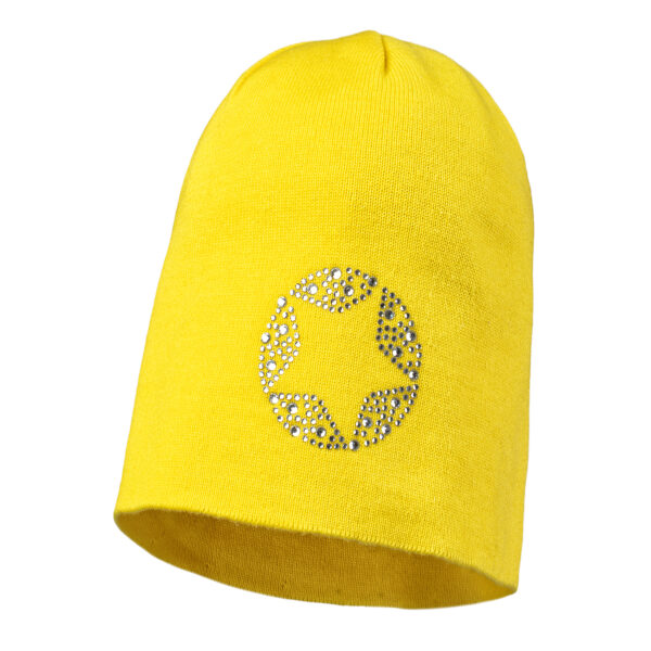 Трикотажна шапка для дівчинки 5-6 років. Виробництво Естонія. Склад - 100% бавовна. Прилягання шапки до голови забезпечує щільна в'язка. Головний убір прикрашає аплікація зі страз "зірка".