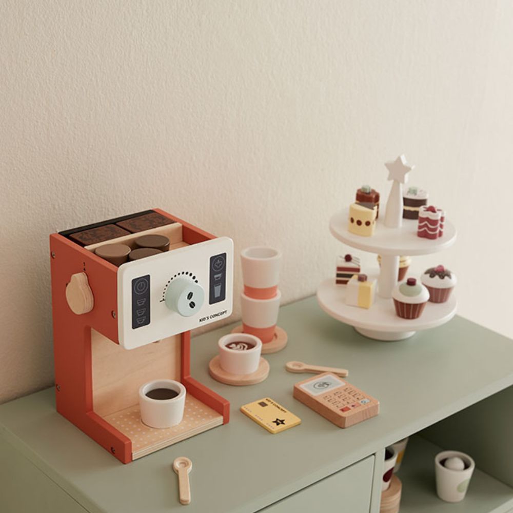 Дерев'яна кав'ярня Kid's Concept дозволить маленькому хлопчику чи дівчинці відчути себе гостинним господарем або баристою. Вона ідеально підходить для рольових ігор. Збоку кавомашини є перемикач увімкнення/вимкнення, спереду - кнопка зі звуком клацання. У верхній частині машини є відділення для зберігання.