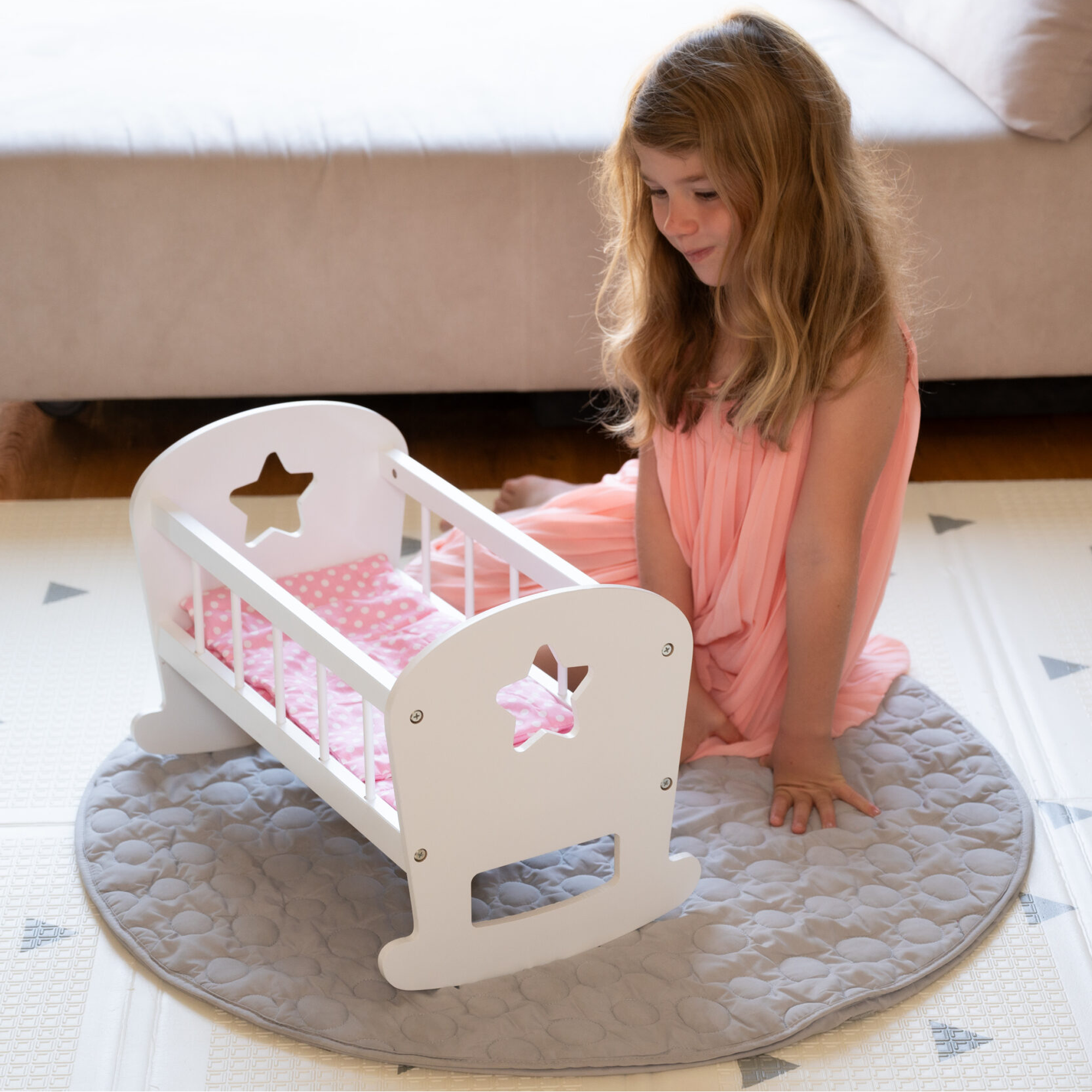 Чи втомилося ваше малятко? Дерев'яна колиска для ляльки FreeON призначена для комфортного розміщення вашого малюка на зручній подушці та прикриття його ковдрою. Ви можете трошки покачати його, і він швидко засне.