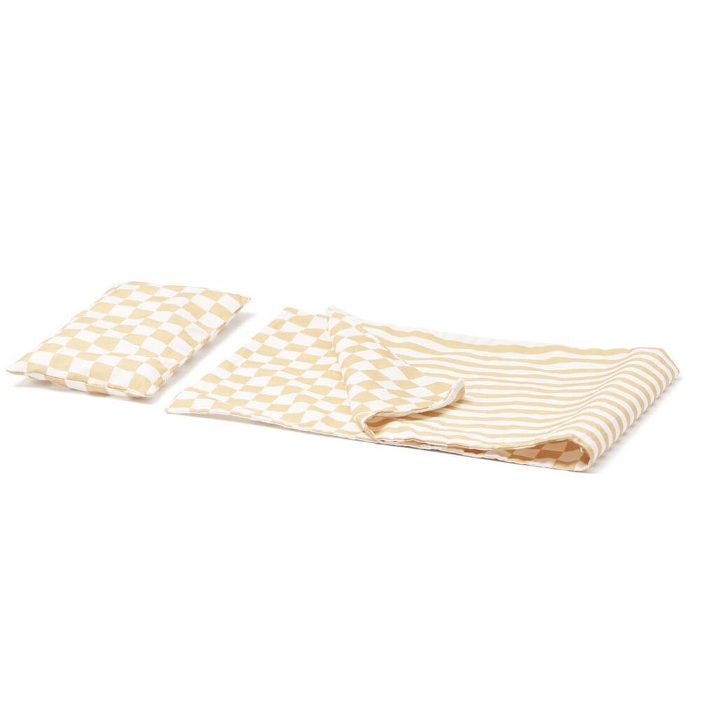 Ліжко оснащене коліщатами, має постільну білизну з двостороннім друкованим малюнком.