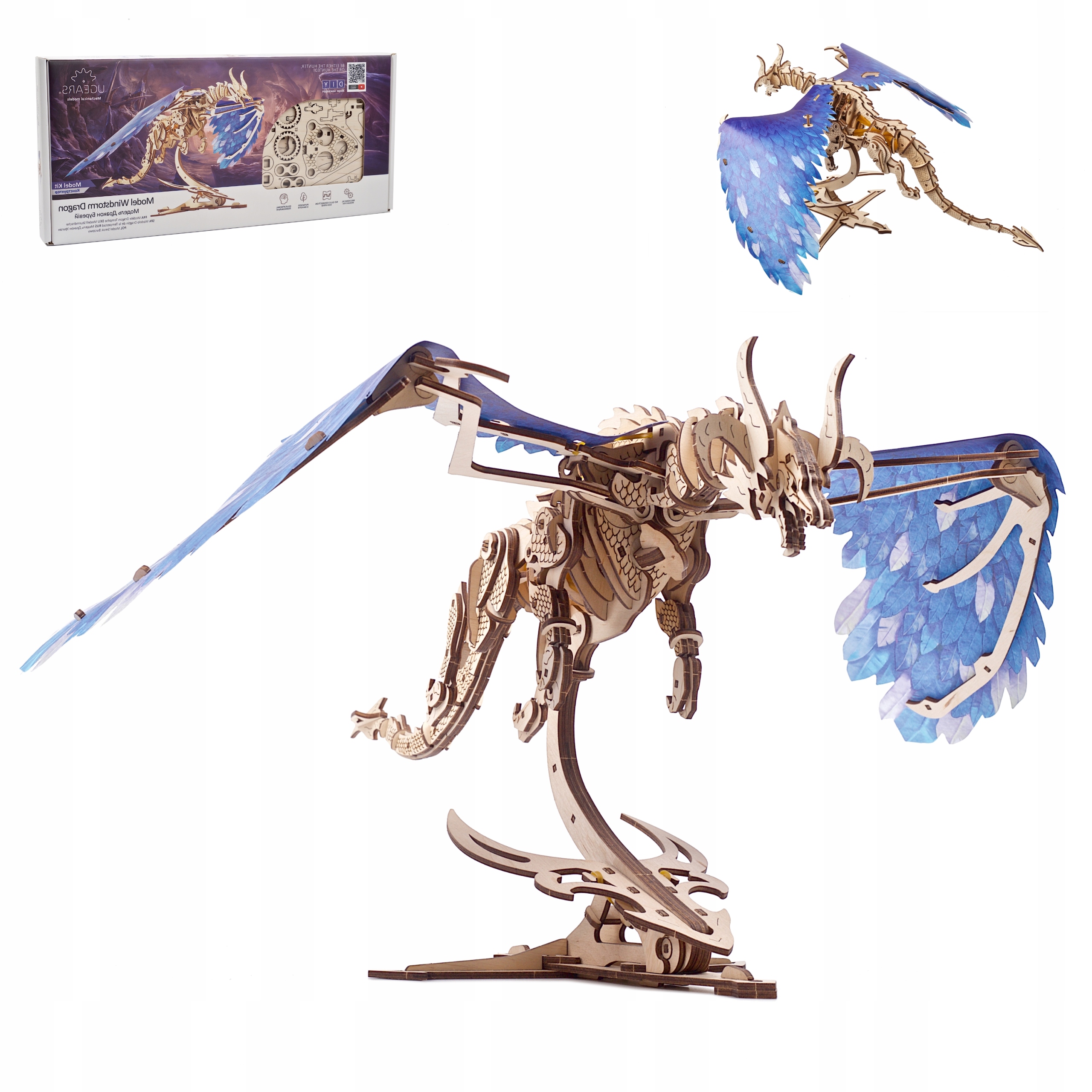 Завдяки оригінальному дизайну, всі рухомі елементи цього 3D-пазла можна спостерігати в роботі. Механічне серце вашого Дракона Ugears — гумомотор — заводиться ключем, розміщеним на його грудях. Притримуючи тіло Дракона, поверніть ключ кілька разів за годинниковою стрілкою, потім натисніть на стартовий важіль, серце заб'ється, оживляючи могутнього крилатого змія. Його руки, ноги та частково тіло почнуть рухатися. Але головне, звичайно, це крила.