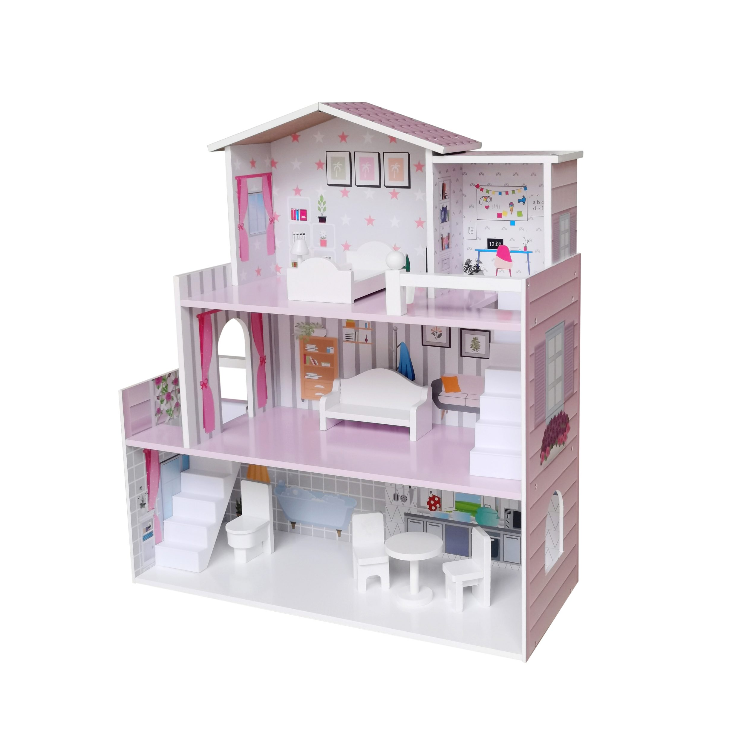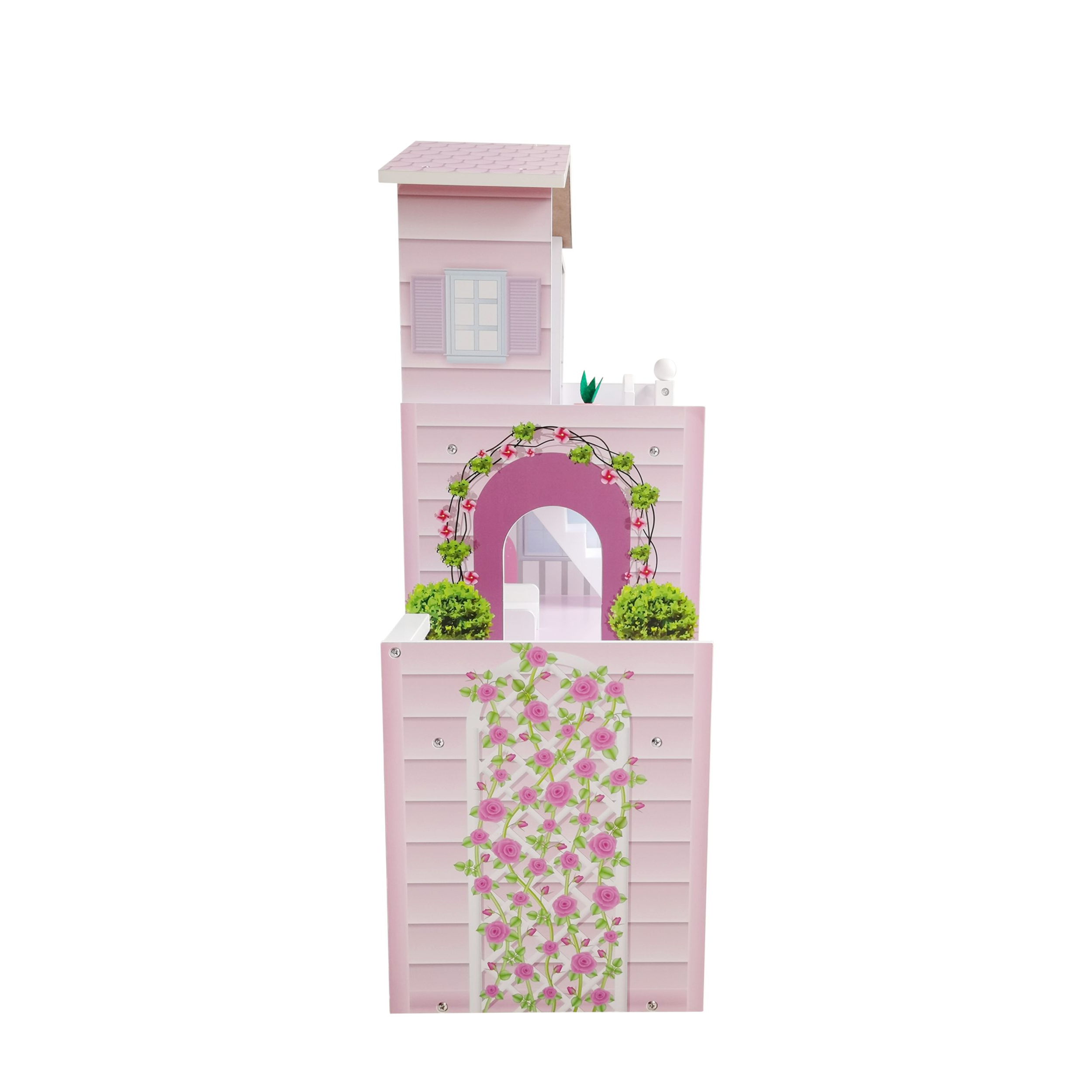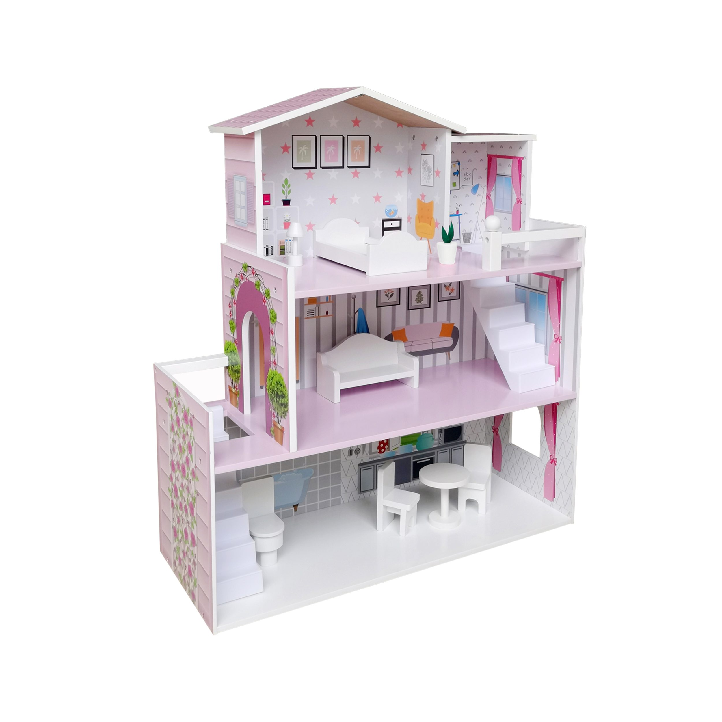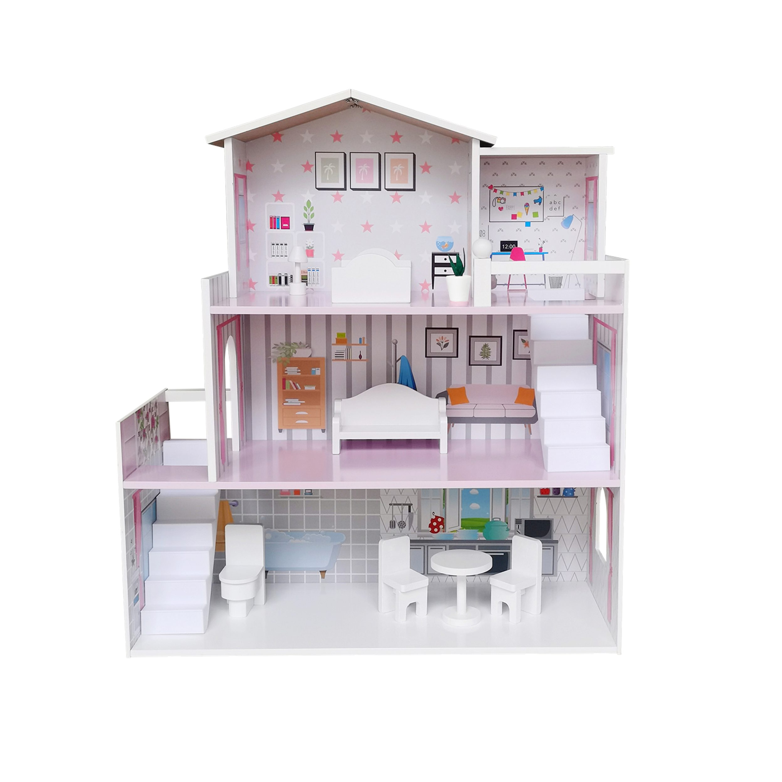 Ласкаво просимо у вашу казкову хатку - дерев'яний іграшковий будиночок FreeON. На першому поверсі знаходиться красива кухня та їдальня з обіднім столом та двома стільцями. Зліва від кухні розташована ванна кімната із туалетом. Сходи ведуть знизу нагору. Тут ви можете відпочити у великій вітальні, обладнаній кріслом-реклайнером. З вітальні піднімайтеся сходами на верхній поверх і слідує сюрприз! Насолоджуйтеся чудовим видом з частково закритого балкона, на якому знаходиться невеличкий садок. З балкона відкривається відкритий прохід до спальні, яка обладнана ліжком та вільностоячою лампою. Тут росте красива зелена рослина, яка додає завершальний штрих.