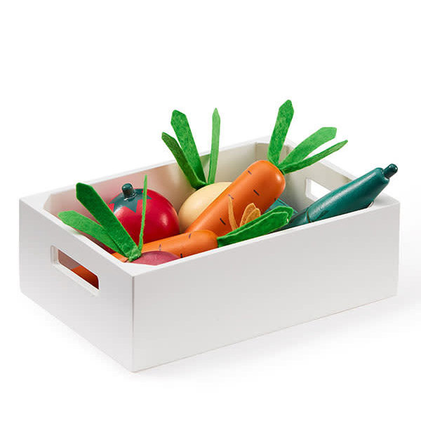 Дерев'яний ігровий набір Kid's Concept KID'S HUB Ящик з овочами ідеально підходить для рольових ігор. Містить іграшкові овочі: моркву, помідор, ріпу, цибулю, буряк, лимон, огірок. Огірок і лимон можна розділити на дві частини і знову з’єднати за допомогою липучки. В комплекті - білий ящик для зберігання.