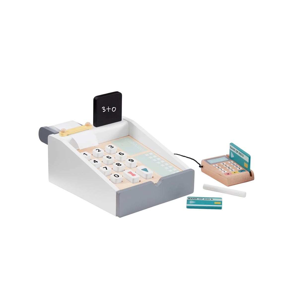 Дерев'яний касовий апарат Kid's Concept дозволить маленькому хлопчику чи дівчинці відчути себе справжнім продавцем. Він ідеально підходить для ігрового кіоску чи магазину. Касовий апарат має кнопки для натискання, дошку для написання цін, білу крейду, відділення для купюр і монет, а також зчитувач карток із двома кредитними картками.
