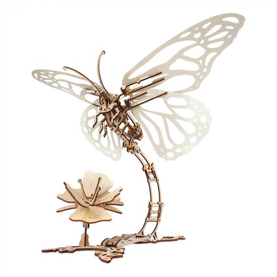 Метелик – це не статична стендова модель, а справжня кінетична скульптура, що імітує політ метелика. Кожна деталь моделі розроблена таким чином, щоб при складанні виконувати свою унікальну функцію в роботі механізму. Модель приводиться в рух гумомотором, працює без зовнішніх джерел живлення або батарейок.