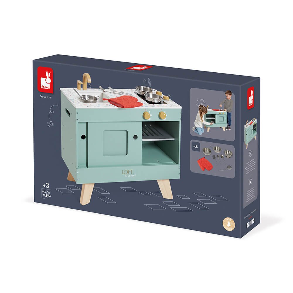 Відкрийте для себе цю чудову дерев'яну кухню в стилі Лофт з вінтажними елементами. Немов центральний острів, ця чудова іграшкова кухня в оливково-зелених тонах займе почесне місце в дитячій спальні або у вітальні, щоб години весело готувати!