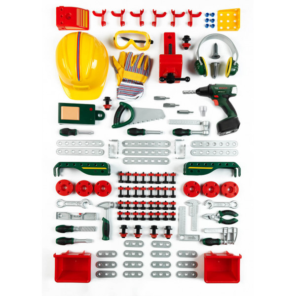 Дитяча майстерня Bosch 150 елементів (8485) оснащена всім необхідним приладдям для будівництва, шліфування, свердління та DIY - все, про що можуть мріяти маленькі умільці.