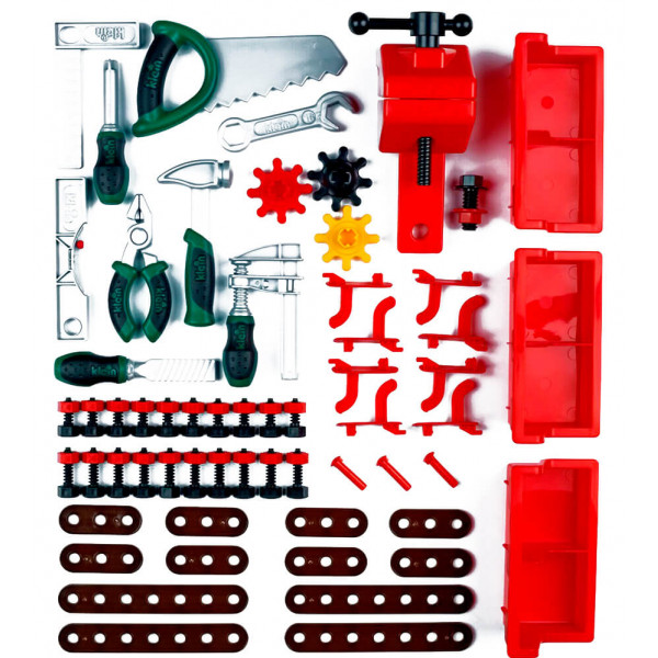 - У набір входять: викрутка, гайковий ключ, плоскогубці, напилок, молоток, пилка, рівень, кутник, гвинтовий затиск, лещата, 3 ящики для зберігання інструментів, кронштейн, шурупи, гайки, короткі та довгі рейки.
