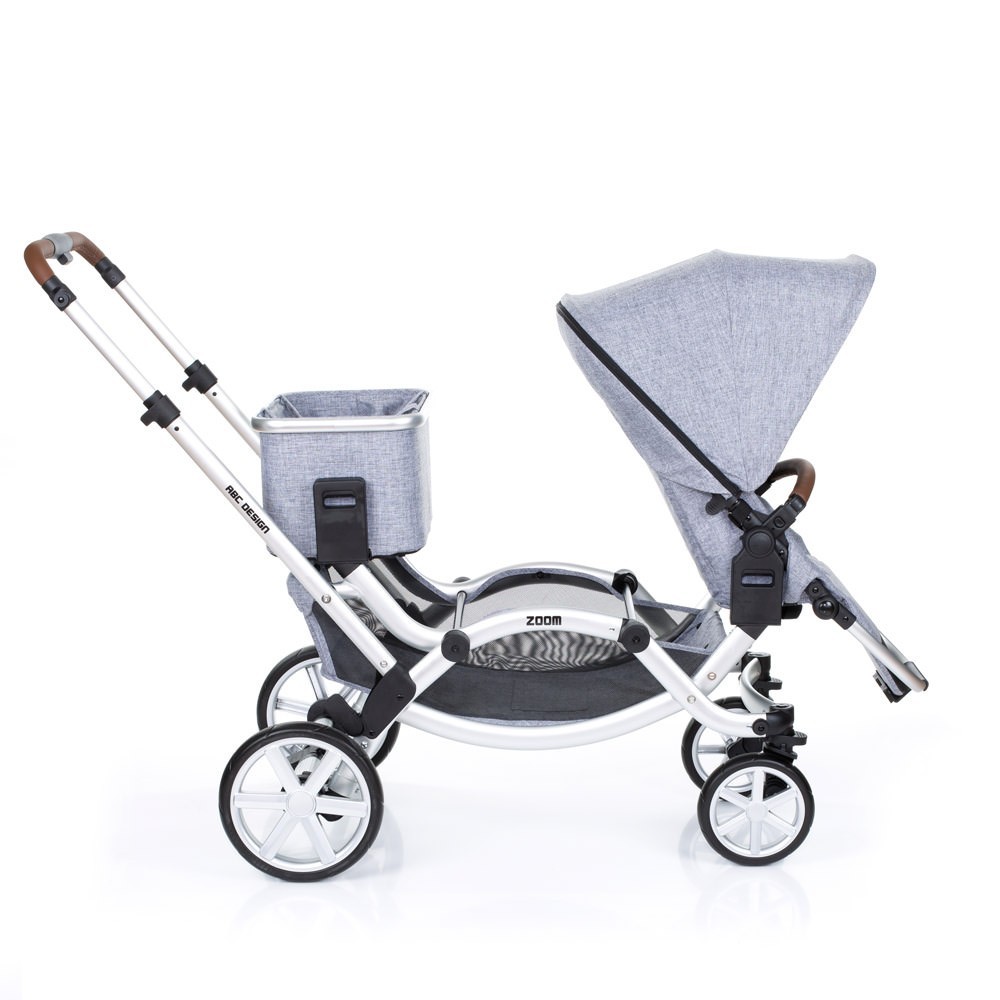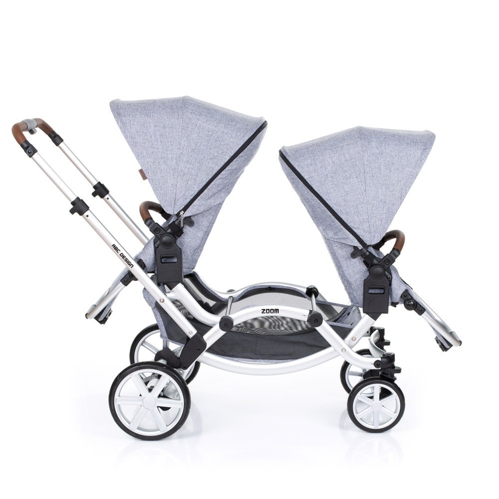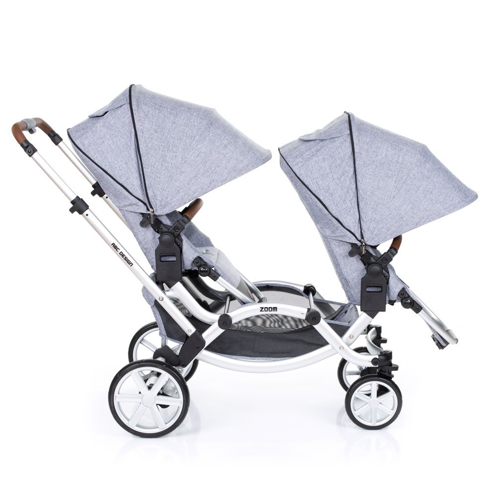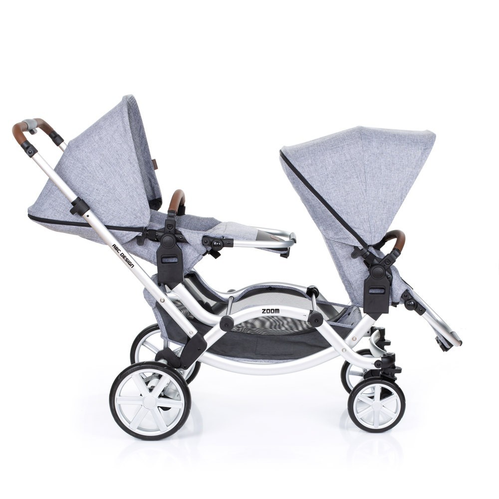 Прогулянкова коляска для двійні ABC Design Zoom - компактна коляска для двійні. Два сидіння, які входять в комплект, можна встановити особою в будь-якому напрямку. Маленькі пасажири зможуть сидіти один за одним або лицем до лиця. Розсувна ручка-поперечина фіксується на будь комфортною для вас висоті. Сидіння легко встановити і відрегулювати, а кут нахилу спинки розрахований так, щоб утримувати хребет дитини в оптимальному положенні.