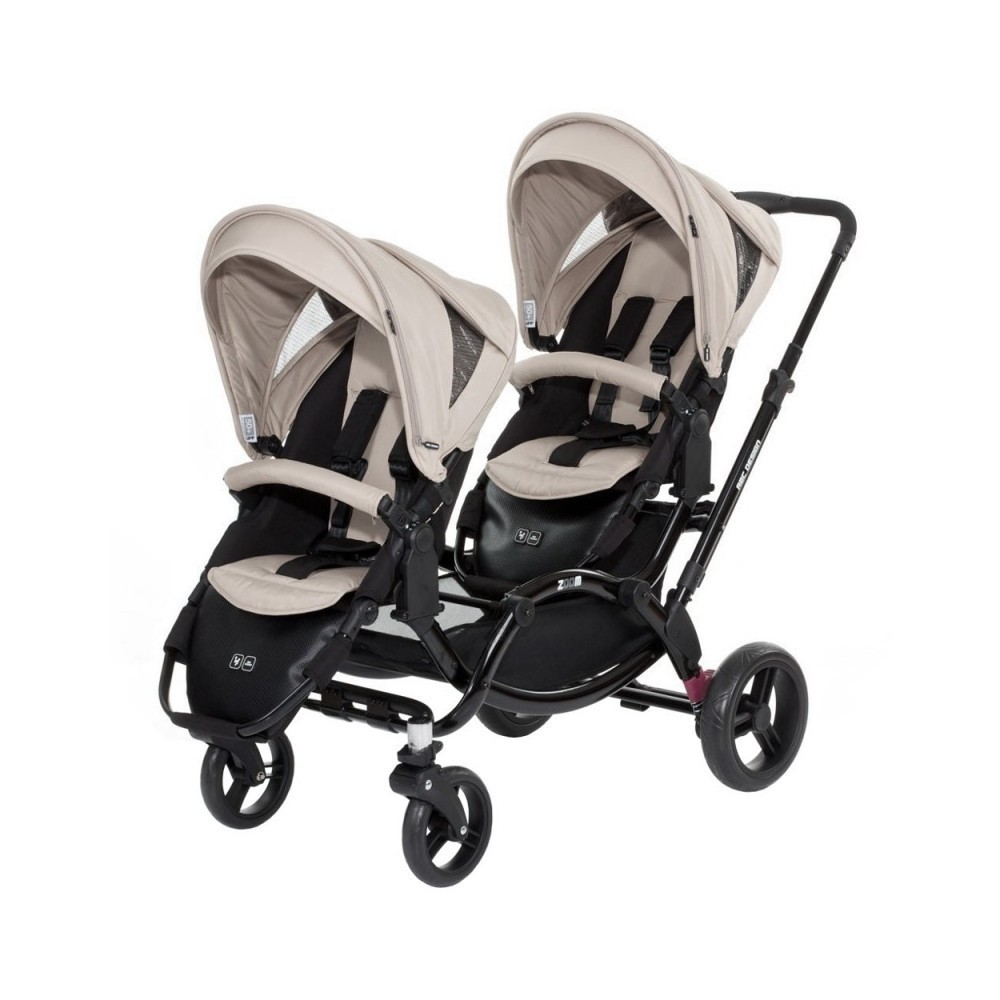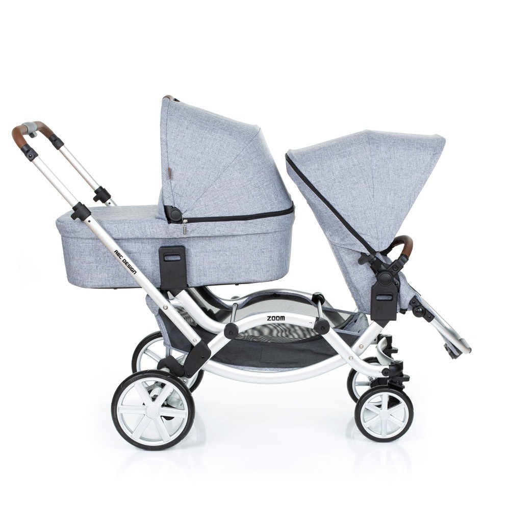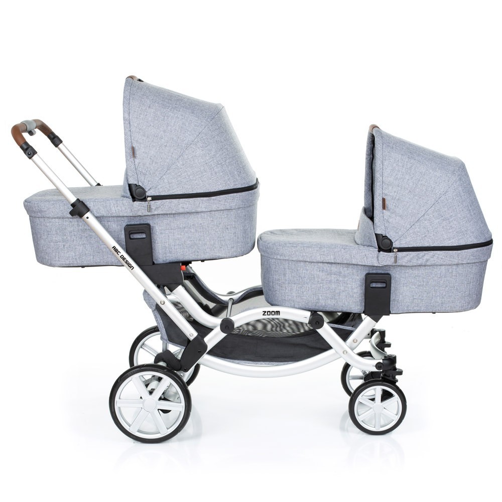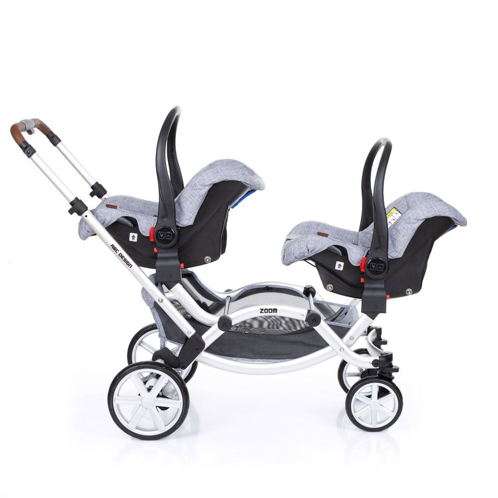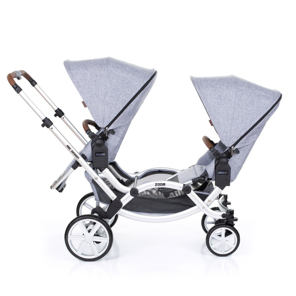 Прогулянкова коляска для двійні ABC Design Zoom - компактна коляска для двійні. Два сидіння, які входять в комплект, можна встановити особою в будь-якому напрямку. Маленькі пасажири зможуть сидіти один за одним або лицем до лиця. Розсувна ручка-поперечина фіксується на будь комфортною для вас висоті. Сидіння легко встановити і відрегулювати, а кут нахилу спинки розрахований так, щоб утримувати хребет дитини в оптимальному положенні.