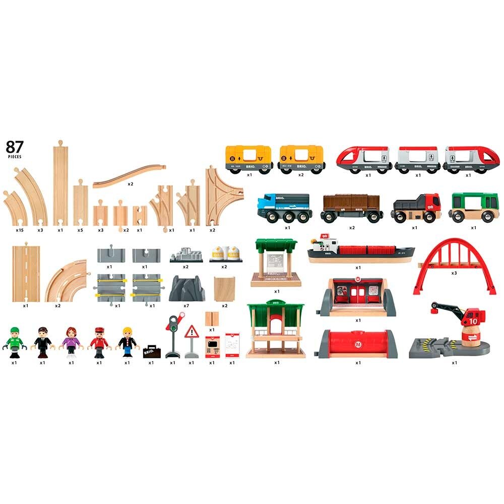 - Складається з 87 деталей, включає пасажирські та вантажні поїзди, сцени з поромом і метро, станції, крани, мости, автомобільні та залізничні колії, фігури та багато іншого.