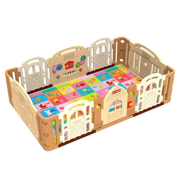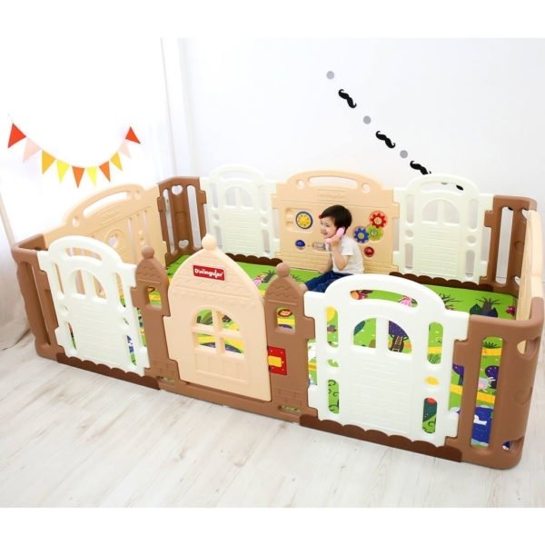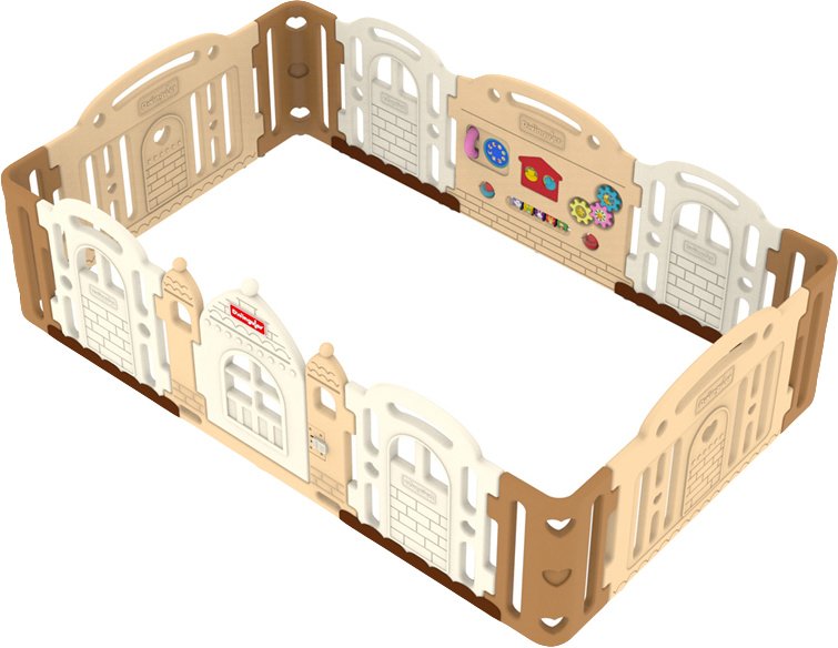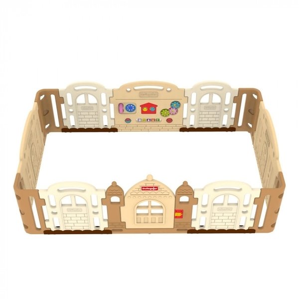 Особливості манежу Dwinguler Castle Caramel: конструкція манежу проста і швидка у збірці; на стінці одного з елементів ігрова панель; підходить для установки будинку, в дитячому саду, на ігровому майданчику в саду або в розважальній зоні торгового центру.