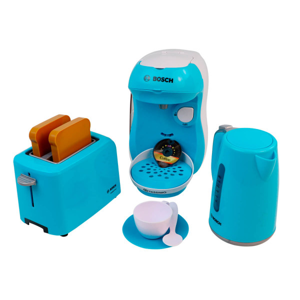 Іграшковий набір для дитячої кухні. Складається з тостеру, чайника, кавоварки та аксесуарів до них.