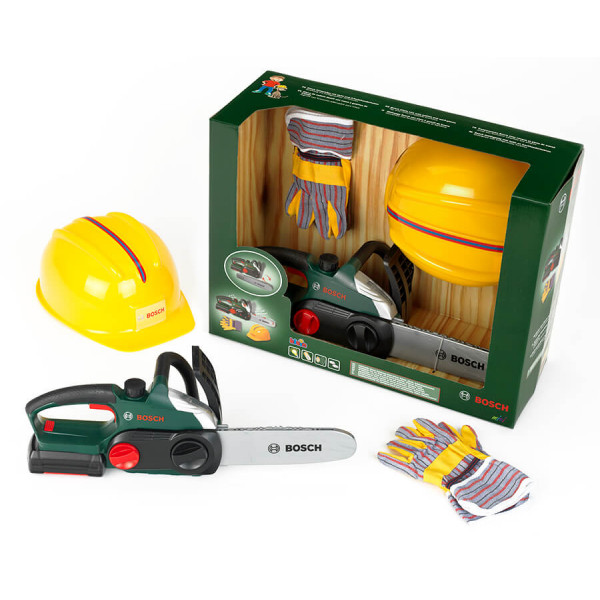 З цією дитячою бензопилою маленькі помічники із задоволенням допоможуть рубати дрова, знімати гілки з дерев або розрізати деревину на дрібні шматки - звичайно, тільки у своїй уяві. Просто надіньте каску, рукавички, підготуйте бензопилу до роботи й повторюйте за батьками.