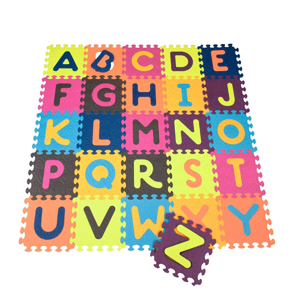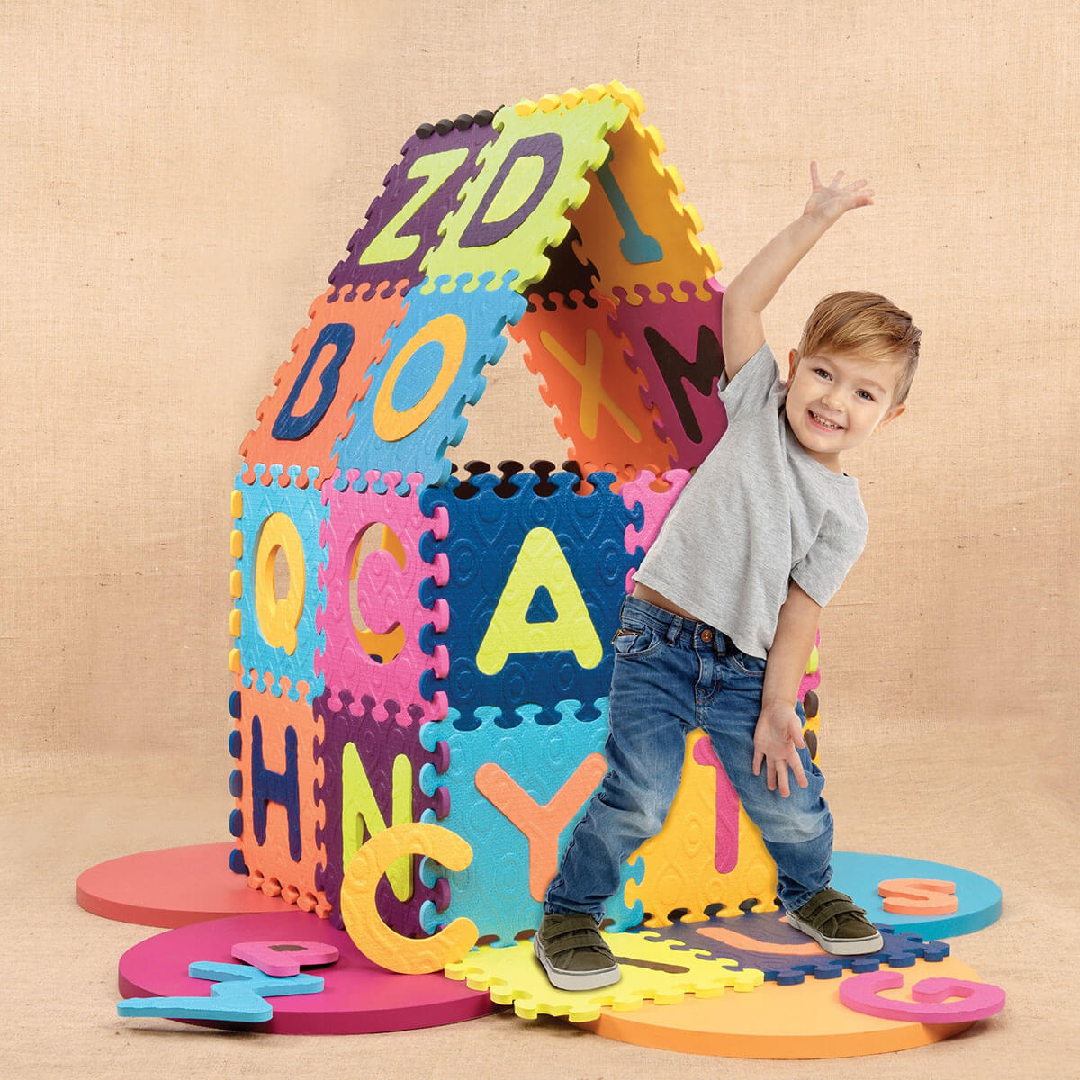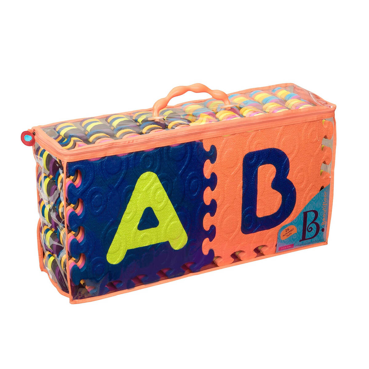 Дитячий розвиваючий килимок-пазл - ABC. Гарний м'який килимок стане комфортним місцем для гри дитини. Килимок складається з 26 деталей, кожна розміром 30 х 30 см. Деталі з'єднуються у вигляді пазла і утворюють килимок 140 х 140 см або навіть... будиночок! Кожна деталь має вставку - англійську букву. Яскраві кольори і характерні орнаменти Battat прикрасять і зроблять веселішим будь-який простір.