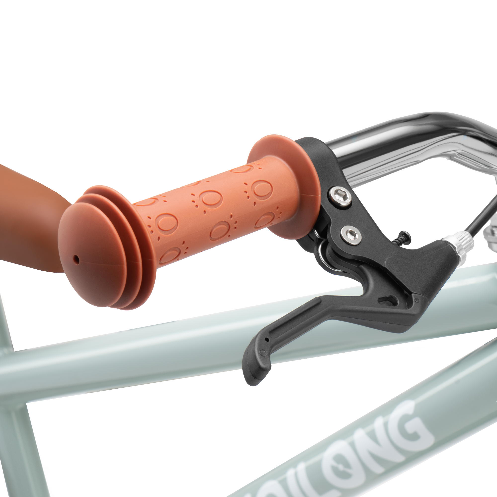 Ручки керма м'які, гумові, з бічним захистом рук у разі падіння. Ручне гальмо, V-Brake на передньому і барабанний механізм на задньому гарантують надійне гальмування.