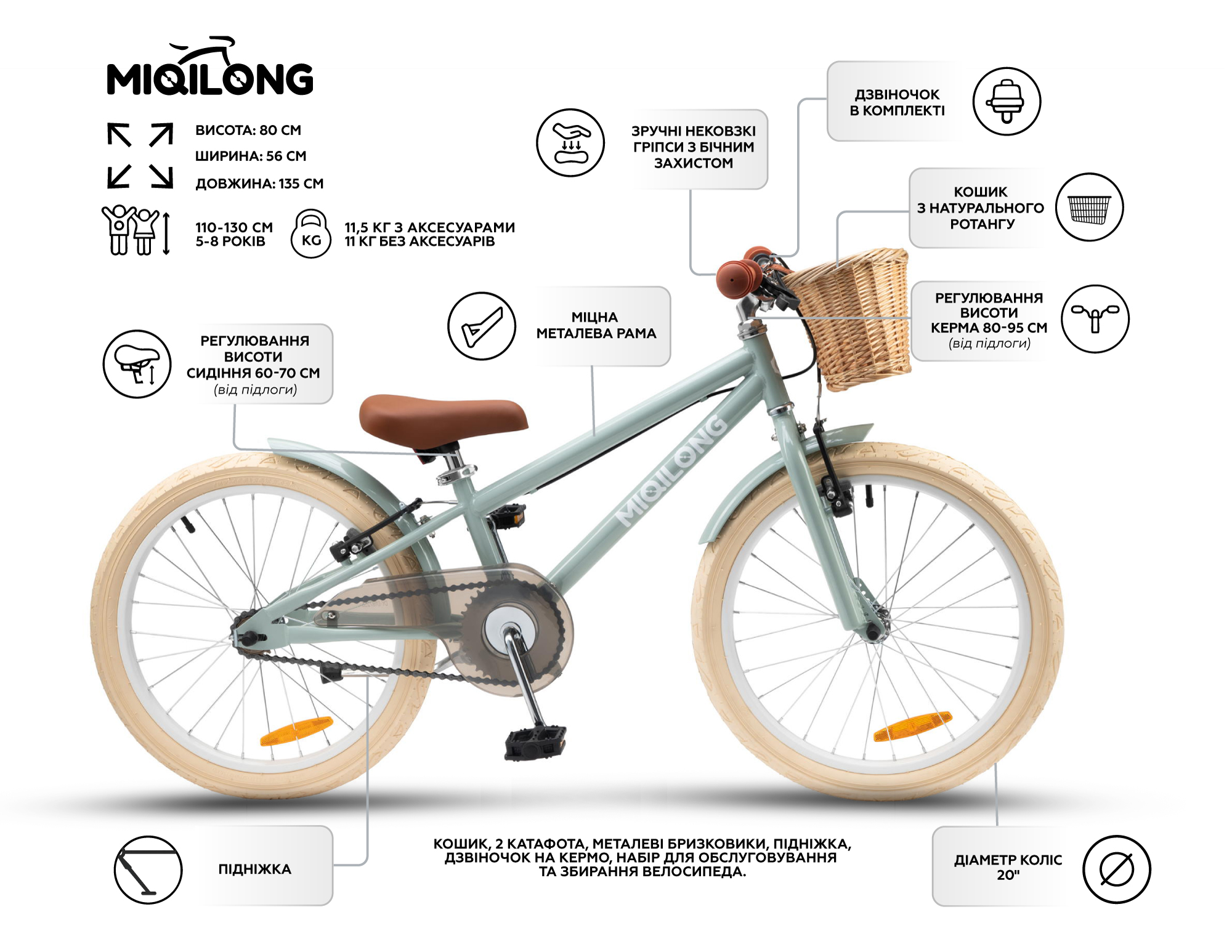 Дитячий велосипед Miqilong RM – це втілення сучасного бачення ретро дизайну. Фарбування в стилі 50-х років ХХ століття та кошик ручного плетіння з натурального ротанга роблять дизайн велосипеда витонченим та вишуканим.