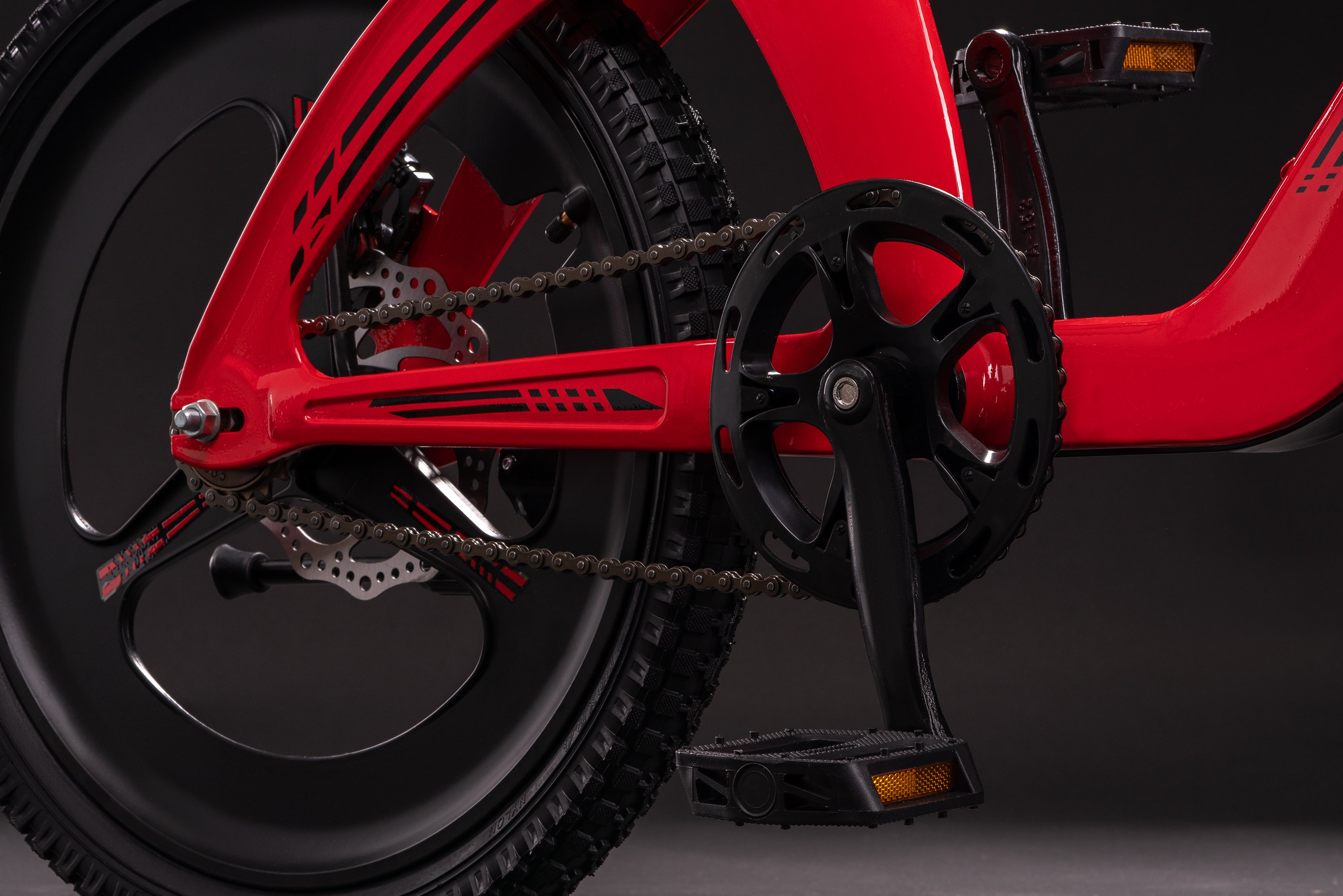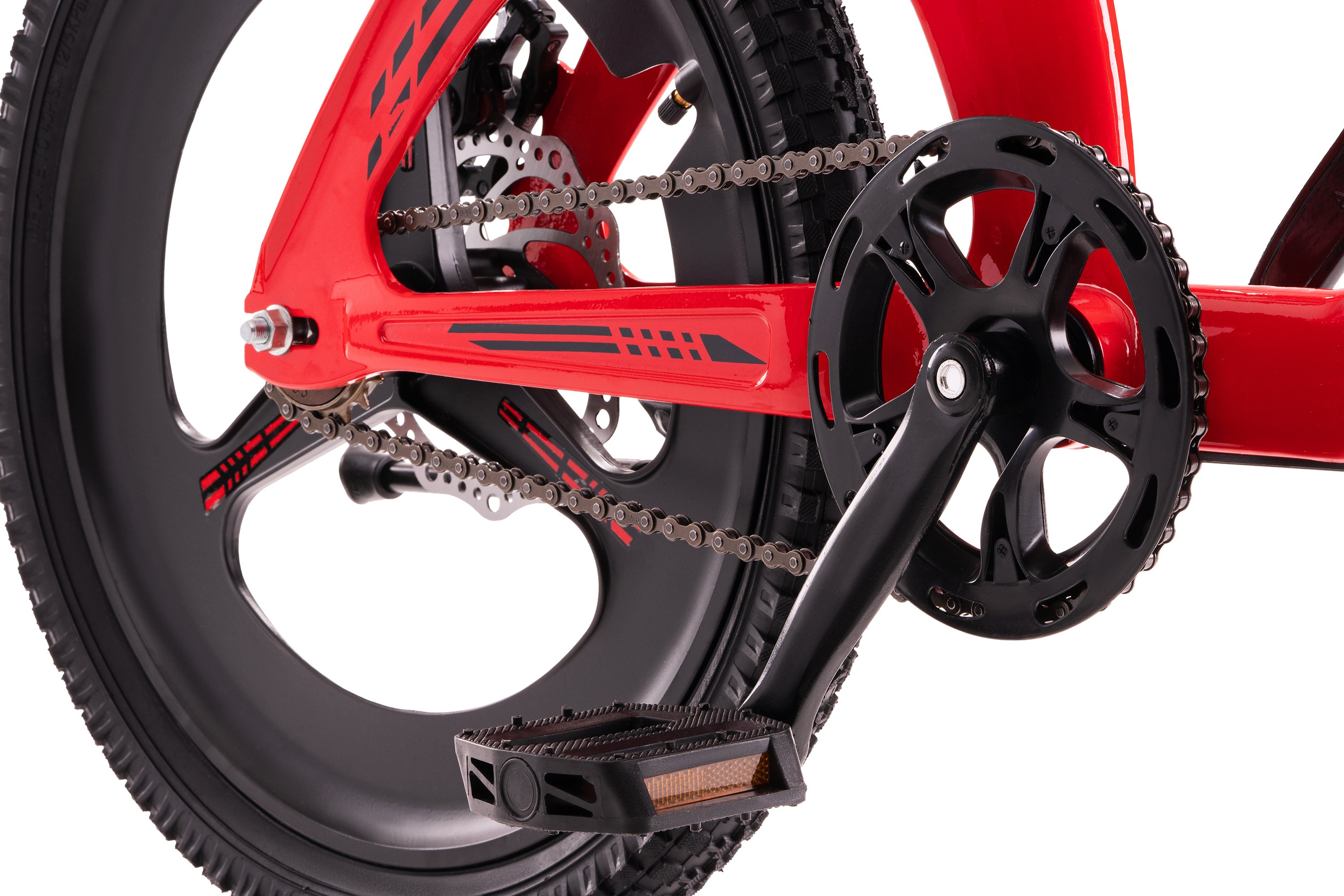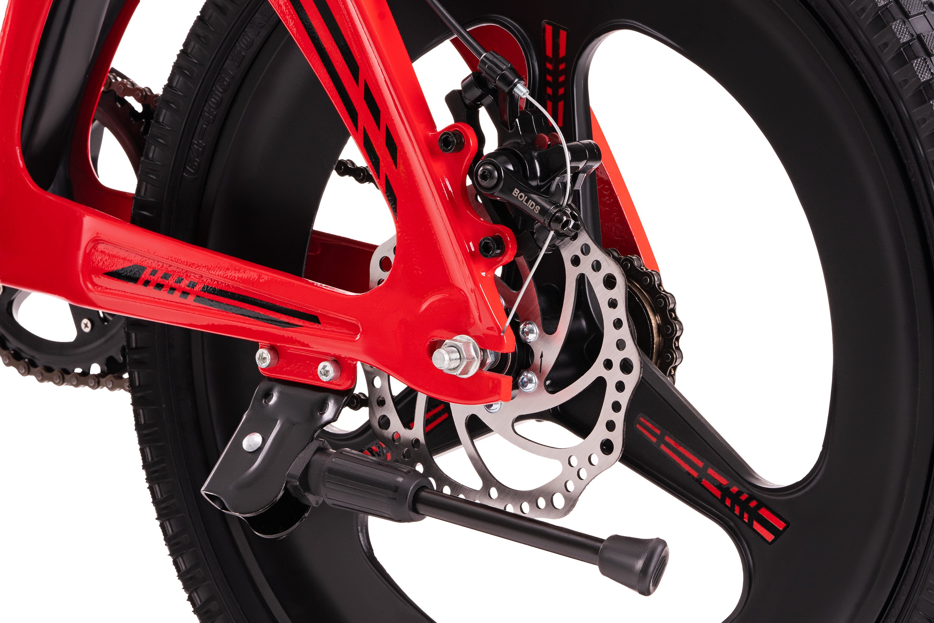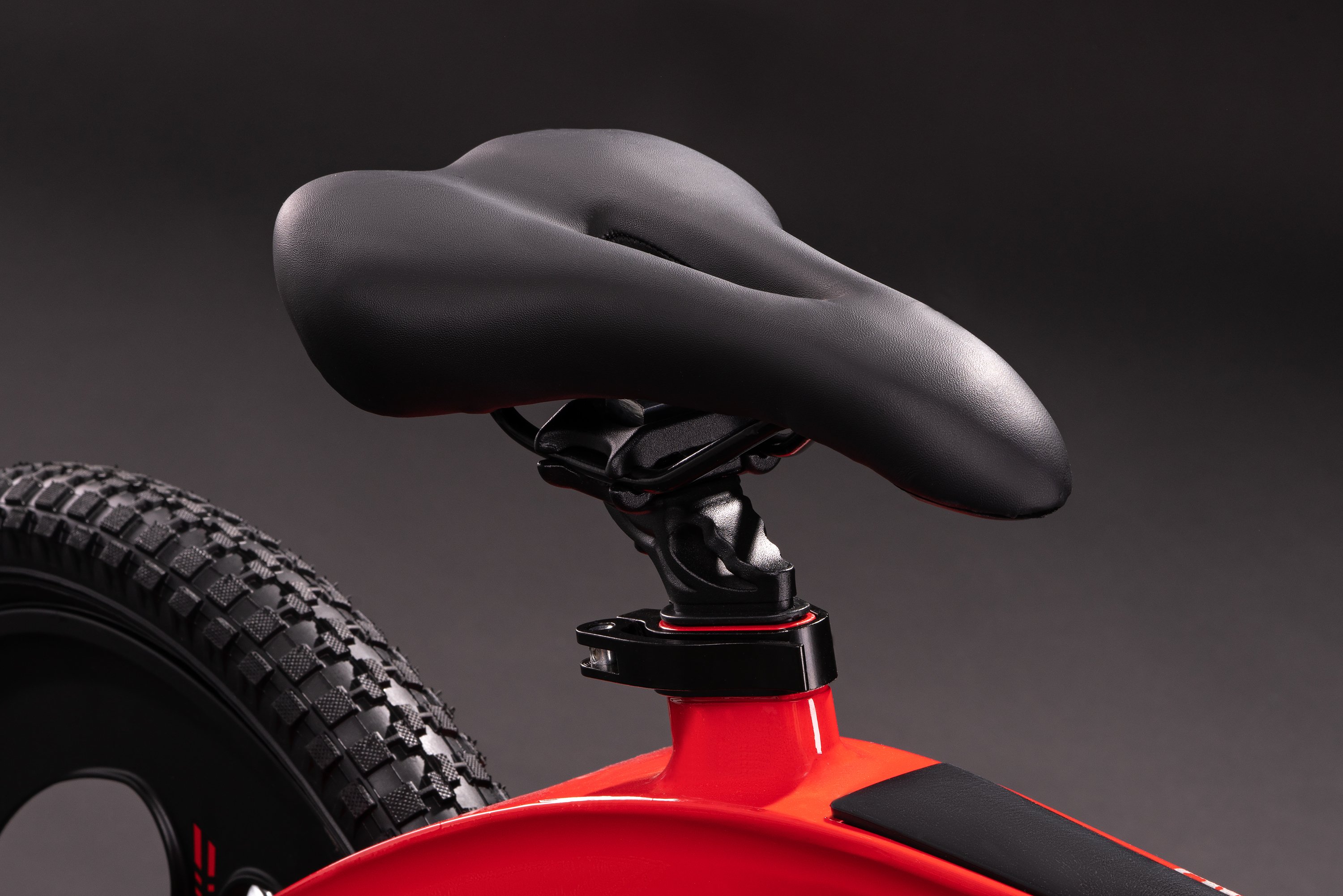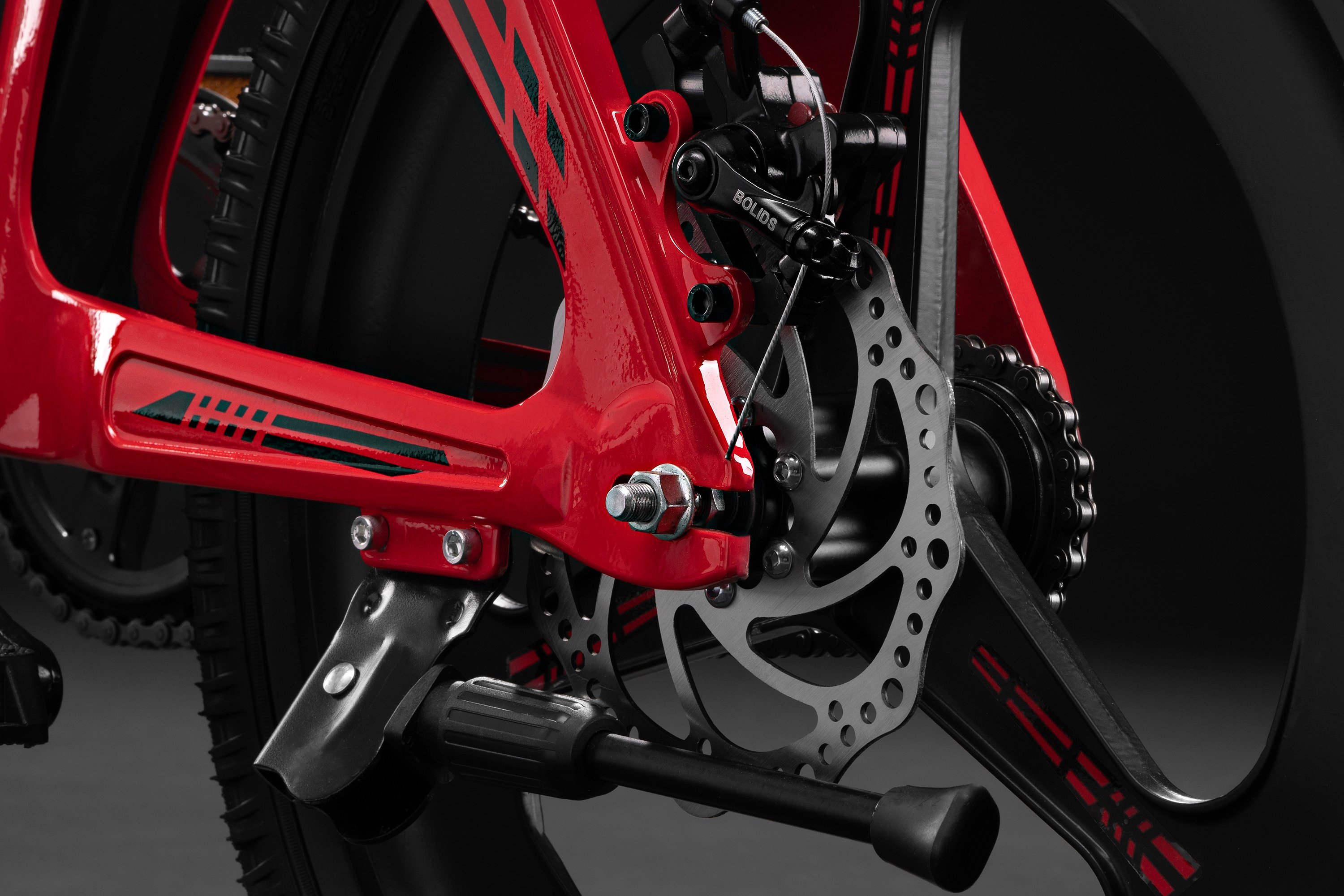 Особливості: рама виконана зі сплаву магнію методом лиття, сідло регулюється по нахилу, як у спортивних велосипедів, алюмінієве кермо на 1/2` надійно фіксується фрезерованим 4 болтовим виносом, напівінтегрована кермова колонка, литі 3 спицеві диски коліс з універсальними покришками дозволяють їздити як асфальтом, так і грунтом, ручні дискові гальма на обох осях.