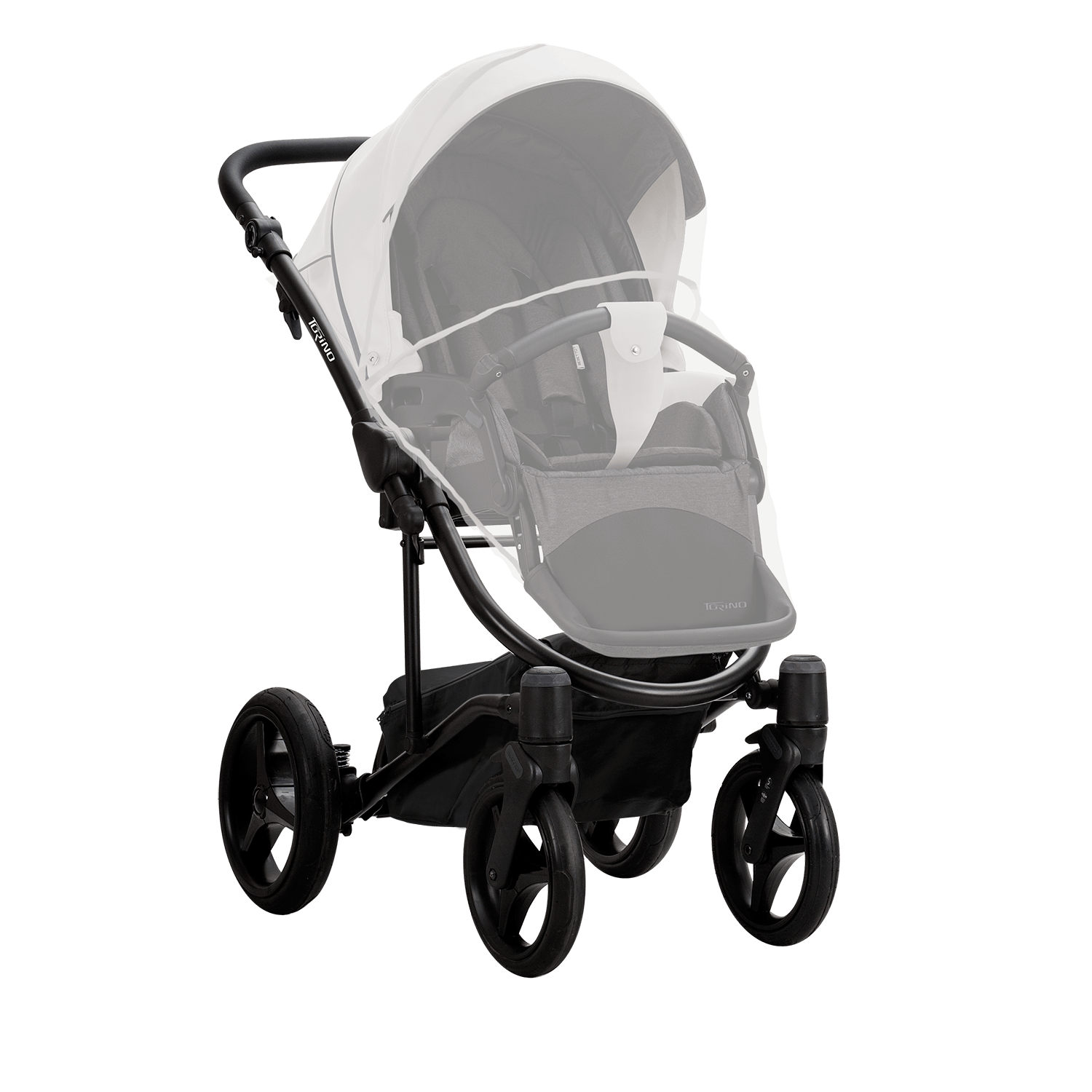 Комплектація коляски Bebetto Torino: Рама з колесами; Люлька з матрациком; Чохол для ніг в люльку; Прогулянковий блок; Чохол для ніг до прогулянкового сидіння; Тримач для пляшечки; Дощовик; Москітна сітка; Сумка для мами; Може комплектуватись автокріслом (замовляється окремо).