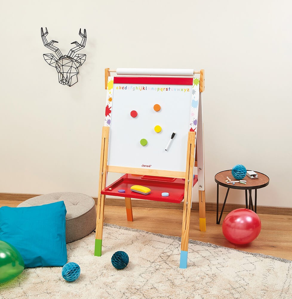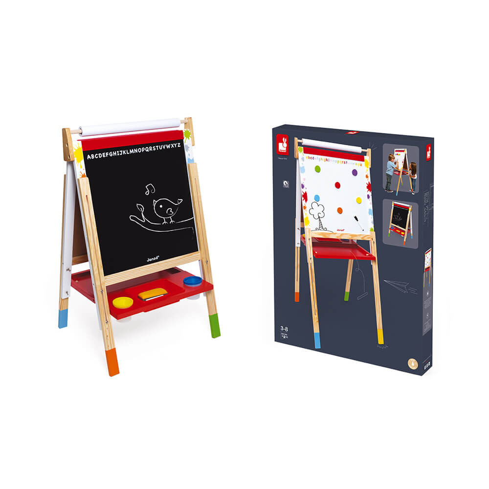 Малюй будь-що і будь-коли на великій дошці-мольберті від французького бренду Janod! Мольберт складається із декількох частин, збирається швидко та легко. Дошка для творчості двостороння – на білій стороні малюйте маркерами, а на чорній – крейдою. Використовуйте маркер, що входить у набір – він оснащений спеціальною губкою, що легко стирає малюнки. До крейди також надається пориста губка, таким чином поле для творчості можна легко та швидко очистити у будь-який момент. Висота зібраного мольберту регулюється – від 91 до 126 см. Розмір робочої поверхні: 47 х 47,5 см. Розвиваючий набір допоможе дитині підготуватись до школи, навчитись писати, рахувати і розвинути творчі здібності. Рекомендований вік: від 3-х років.