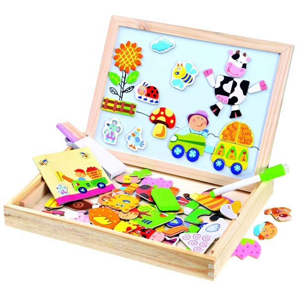 У набір входить: Набір магнітних деталей тварин, деталей для транспорту, дерев, квітів, будиночка. Набір крейди різних кольорів. Фломастер на водній основі для багаторазового використання. Губка для стирання малюнків на обох поверхнях дошки. Інструкція з можливими варіантами використання магнітиків.