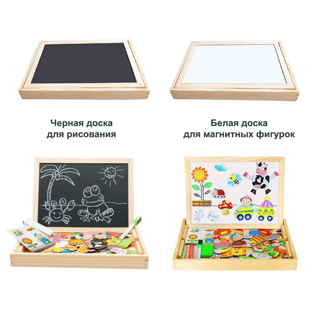 У вашому розпорядженні комплект деталей різних форм і забарвлень. А магнітна дошка допоможе оживити будь-які пригоди. На зворотному боці знаходиться зручна поверхня для малювання крейдою.