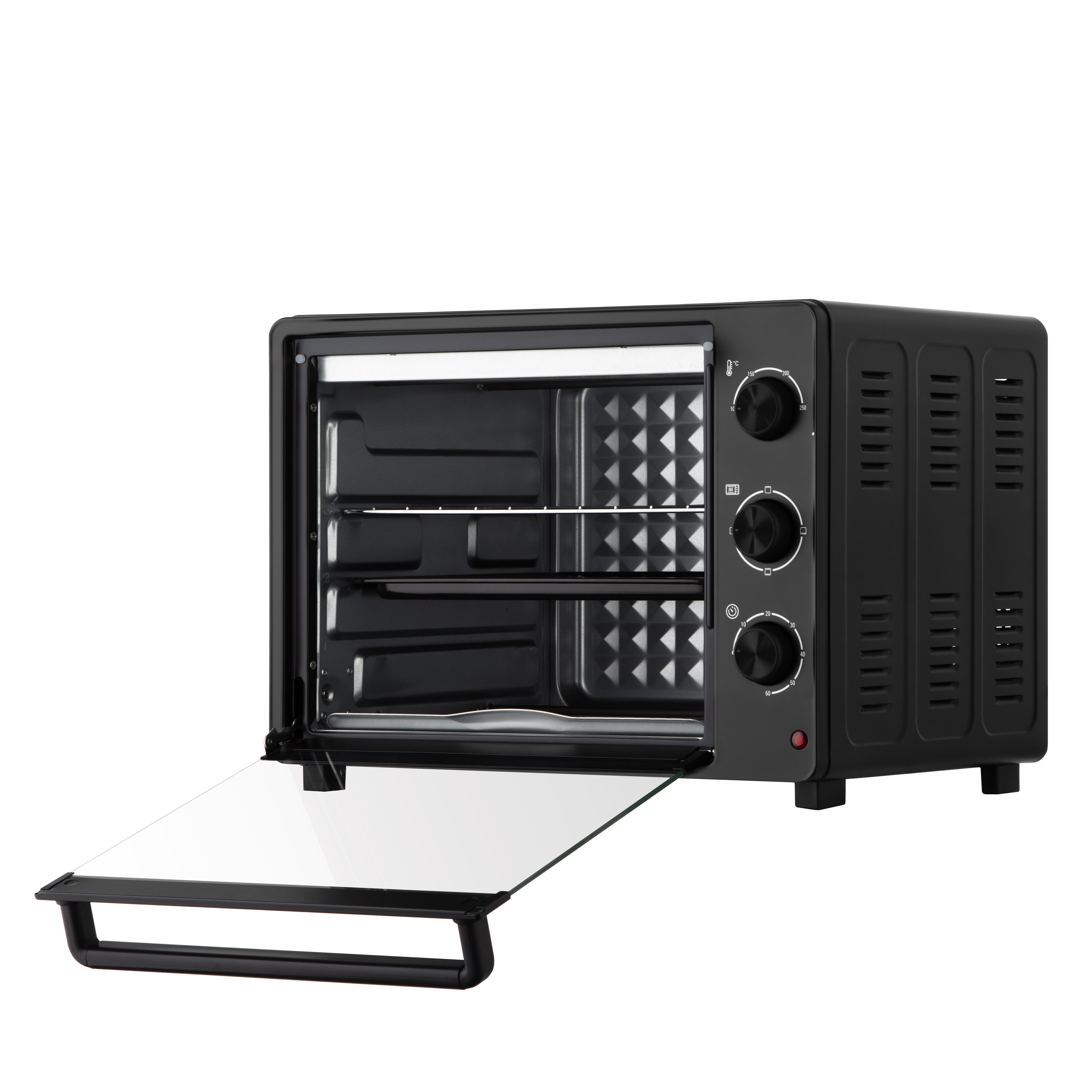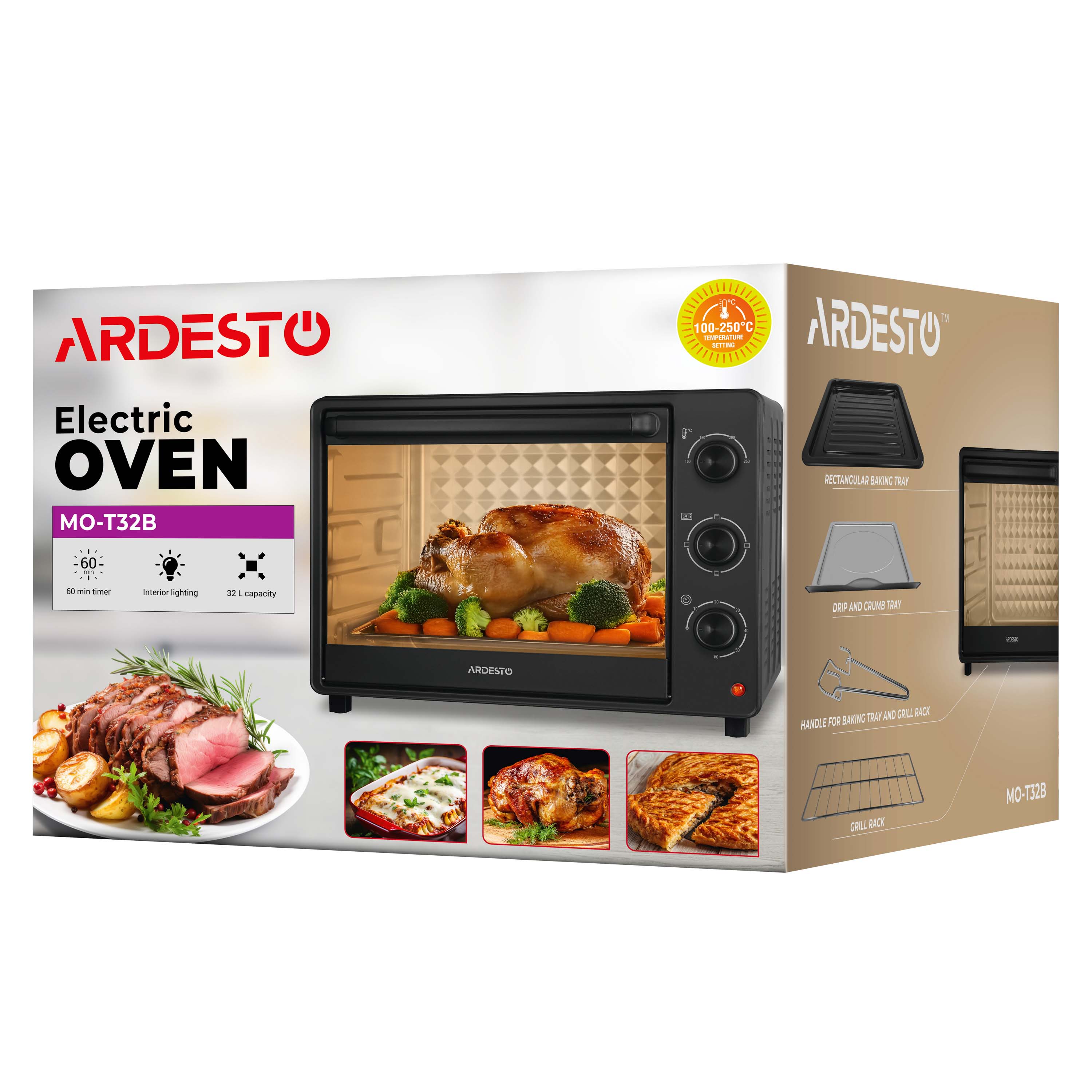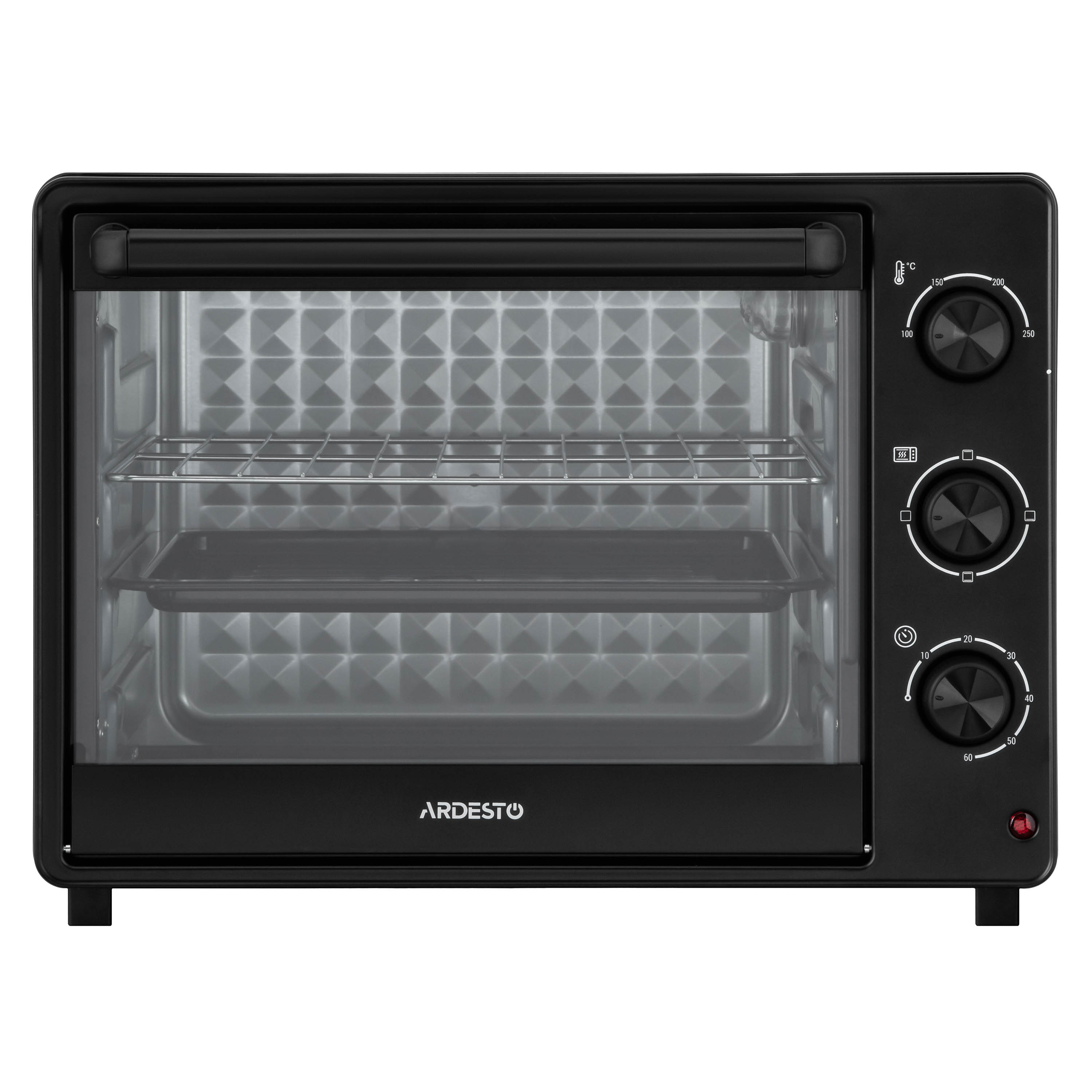 Електрична піч ARDESTO – компактне рішення для приготування улюблених страв удома чи на дачі. Об’єм 32 л і три режими нагрівання дають змогу запікати, розігрівати або готувати гриль. Температурний діапазон від 100 до 250 °C і таймер 60 хв забезпечують точний контроль процесу. Модель оснащено внутрішнім освітленням, індикацією завершення готування, дверцятами із загартованого скла й нагрівальними елементами з нержавіючої сталі. У комплекті – решітка для гриля, деко, піддон для крихт і рідин, а також зручне руків’я для їх виймання. Завдяки стійким нековзним ніжкам забезпечено стійкість на поверхні.
