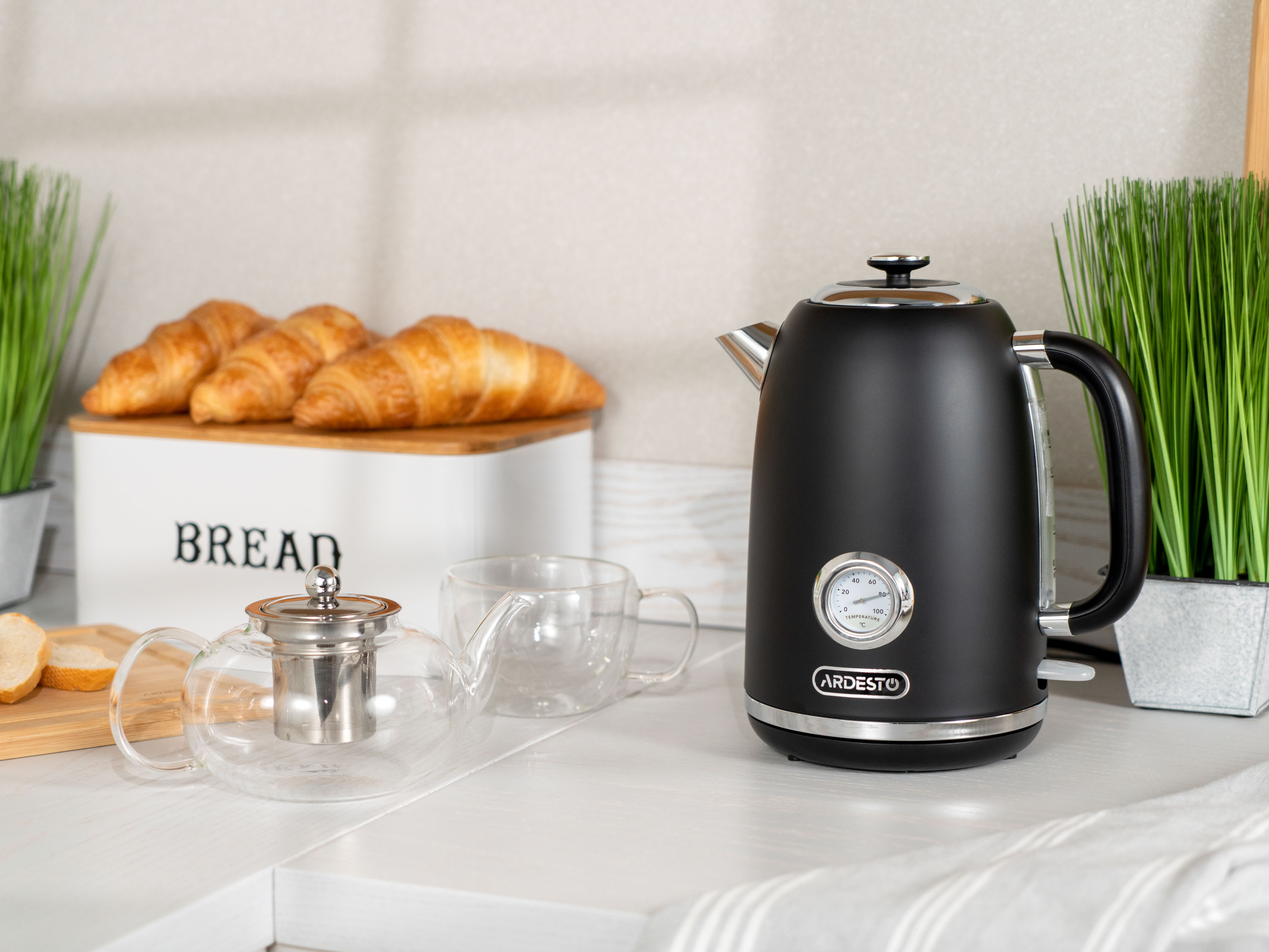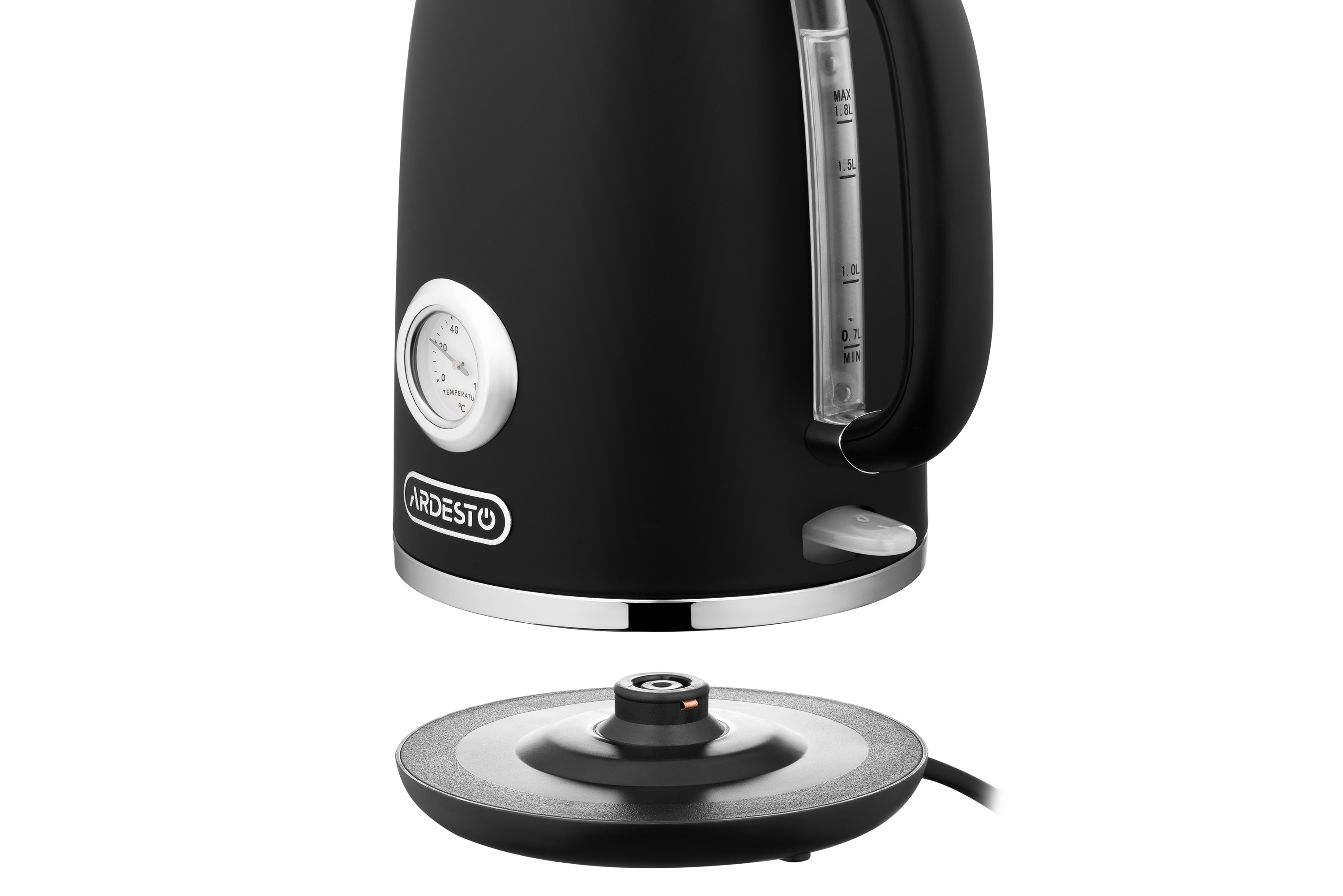 Електричний чайник ARDESTO EKL-F410BM чорного кольору. Корпус із нержавіючої сталі, ручка ергономічна. Модель оснащено британським контролером Strix. Передбачено функцію вимикання у разі відсутності води та після її закипання. Потужність становить 2 200 Вт, а об’єм – 1,8 л. Зручна підставка обертається на 360°. Оснащено вінтажним індикатором температури. Прихований нагрівальний елемент.