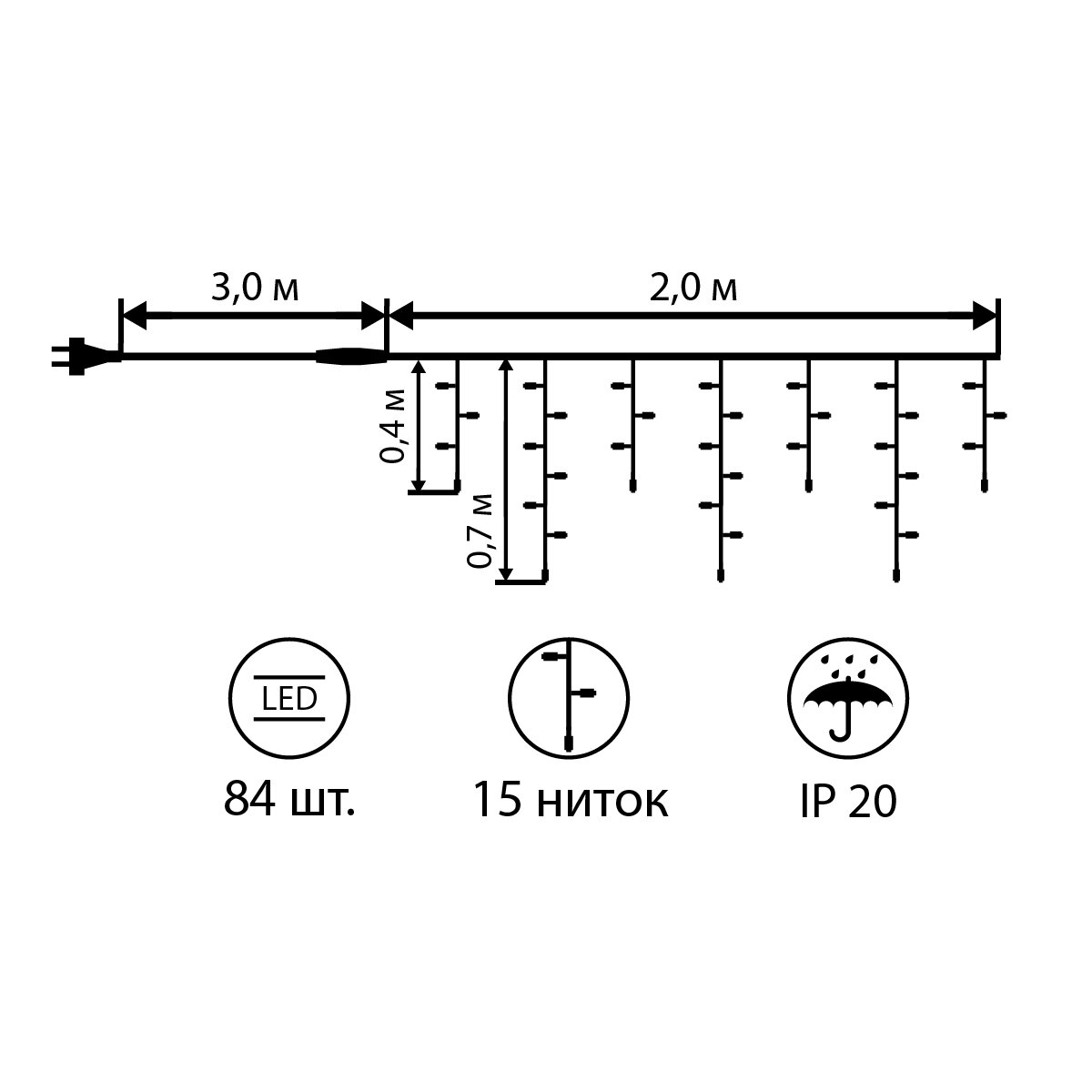 Електрогірлянда-штора використовується як віконний декор в період новорічних та різдвяних свят. Колір лампочок, що світяться: тепло-білий. Кількість лампочок: 84 шт. Ширина дроту: 2,10 м. Довжина ниток: 40 см і 70 см. Кількість ниток: 15 шт. Джерело живлення: від мережі (220 В, 50 Гц, 3,6 Вт).