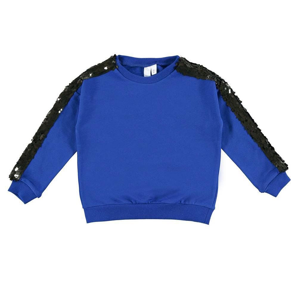 Трикотажний теплий синій реглан з бавовняного флісу для дівчаток прикрашений аплікаційною стрічкою з блискітками посередині рукава реглану по всій довжині. Горловина, манжети та талія оброблені трикотажною подвійною гумкою, що запобігає розтягуванню після прання.