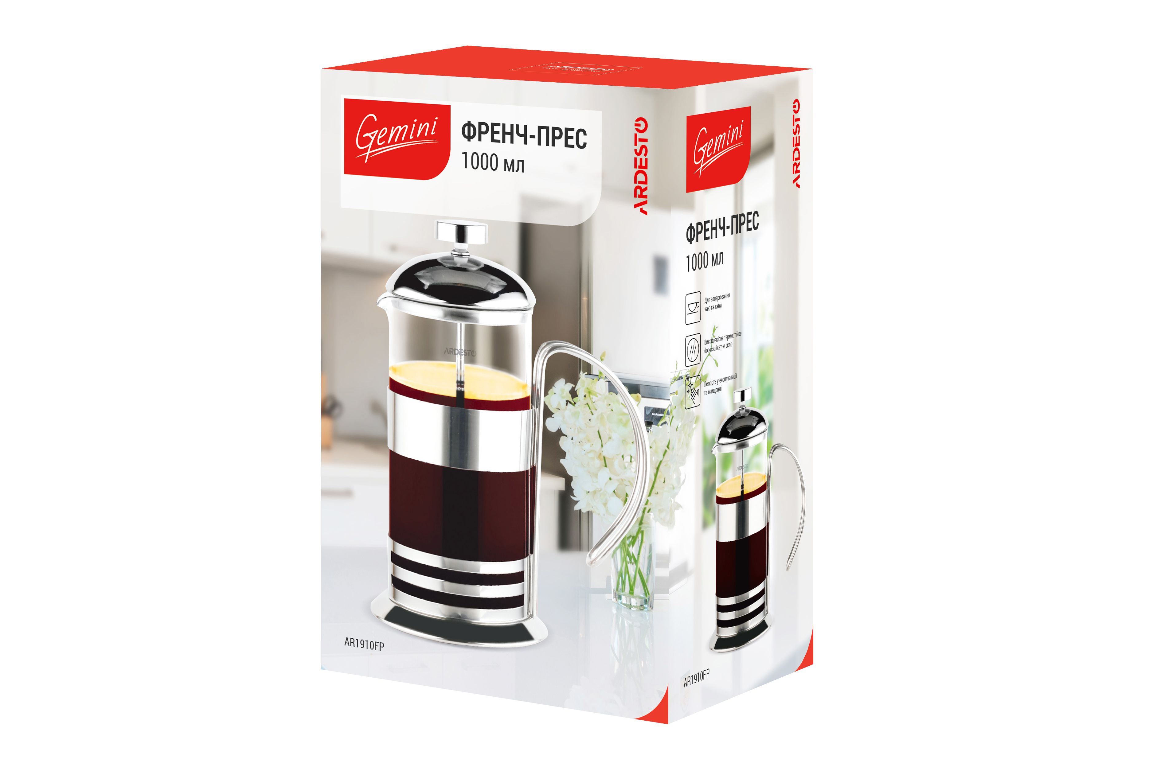 Френч-прес серії Gemini для приготування гарячих та холодних напоїв. Об’єм складає 1000 мл. Корпус чайника виготовлено з нержавіючої сталі, знімну колбу з боросилікатного скла, а фільтр з нержавіючої сталі. Підходить для очищення в посудомийній машині.