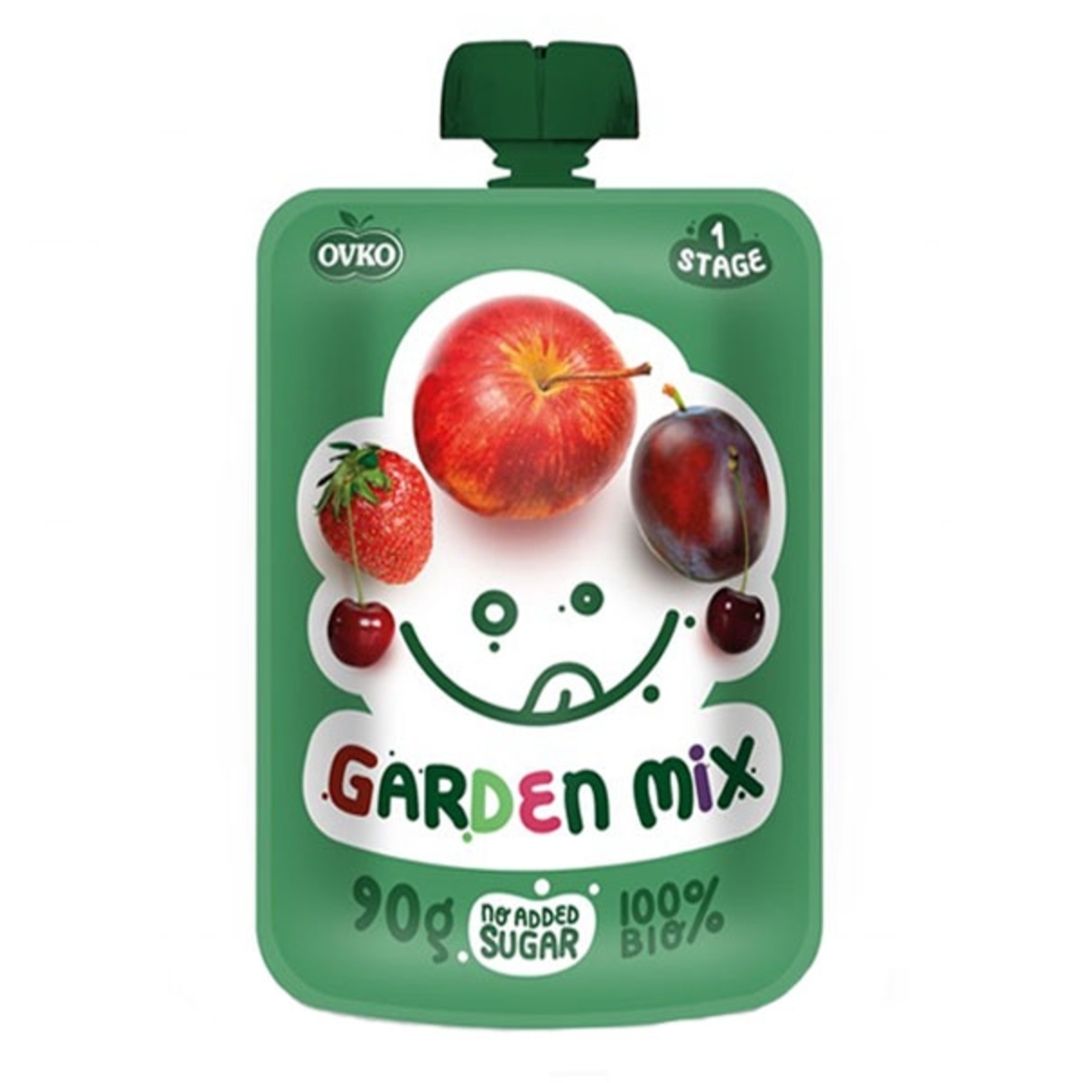 Склад: органічне яблучне пюре 70%, органічне полуничне пюре 10%, органічне вишневе пюре 10%, органічне сливове пюре 10%.
