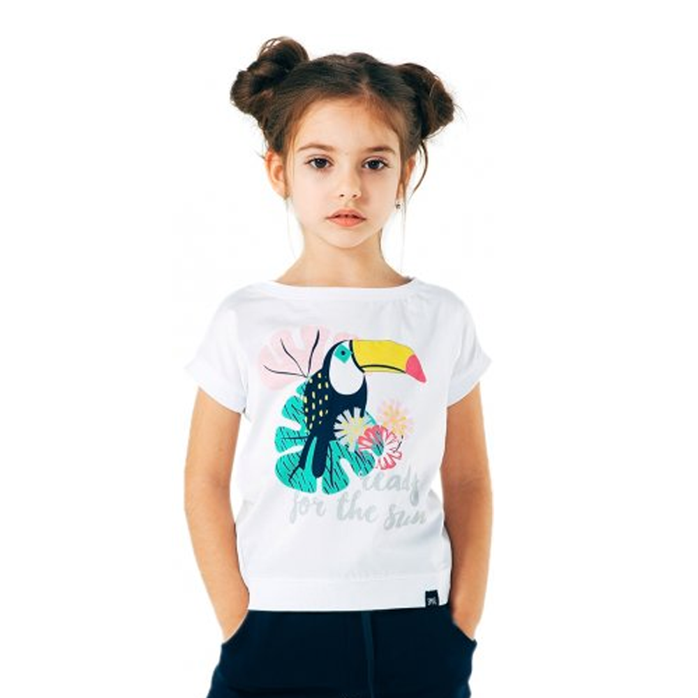 Модна футболка з яскравим принтом та крутим написом - відмінне вбрання на кожен день влітку! Її можна доповнити спідницею, шортами чи джинсами. Підійде дівчаткам від 3 до 6 років. Біла футболка "Тропічний рай" прикрашена зображенням тукана. Коралова - малюнком папаї, м'ятна - ігуани, рожева - червоної квітки. Футболки пошиті з куліру: 90% бавовни, 10% еластан.
