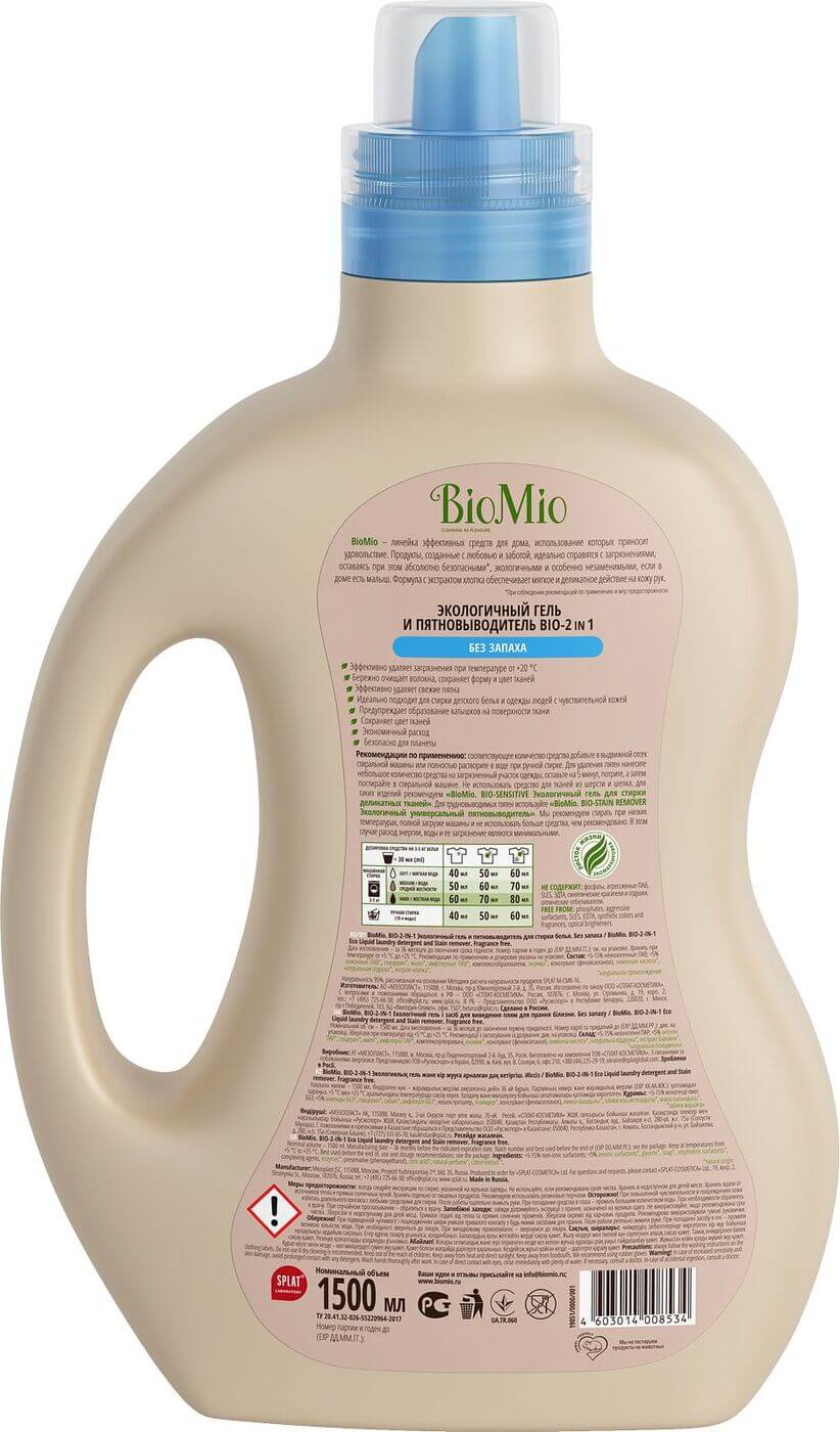 Більше не потрібно використовувати багато засобів для прання, гель-плямовивідних компанії BioMio — Bio-2in1 працює за двох. Дбайливо відпире ваші речі, видаляючи всі плями. Це безпечний, екологічний засіб, на 87,7% складається з натуральних компонентів. У складі відсутні фосфати, агресивні ПАР, SLES, барвники та оптичні відбілювачі. Не шкодить довкіллю. Натуральний, мильний запах, без ароматизаторів. Економно витрачається, вистачає на більше, ніж на 30 розів. Дбайливо очищує одяг і тканини, видаляє складні плями, зберігаючи при цьому форму й колір виробів. Підходить для речей людей, що мають чутливу шкіру, а також для прання дитячих речей. Починає працювати при температурі від 20 °С.