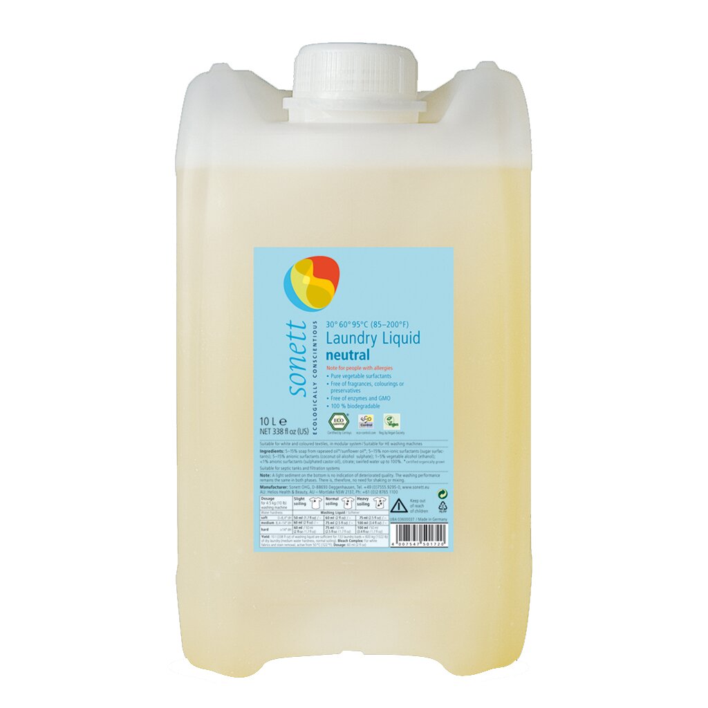 Засіб для прання забарвлених і білих виробів Sonett нейтральний підходить для білої, кольорової та чорної білизни. Призначений для виробів із бавовни, льону, синтетики. Ефективний у разі низькотемпературного прання та прання в жорсткій воді. Не має шкідливого впливу на шкіру. Прання за температури 30-95 °C. Завжди дотримуватися вказівок виробника.