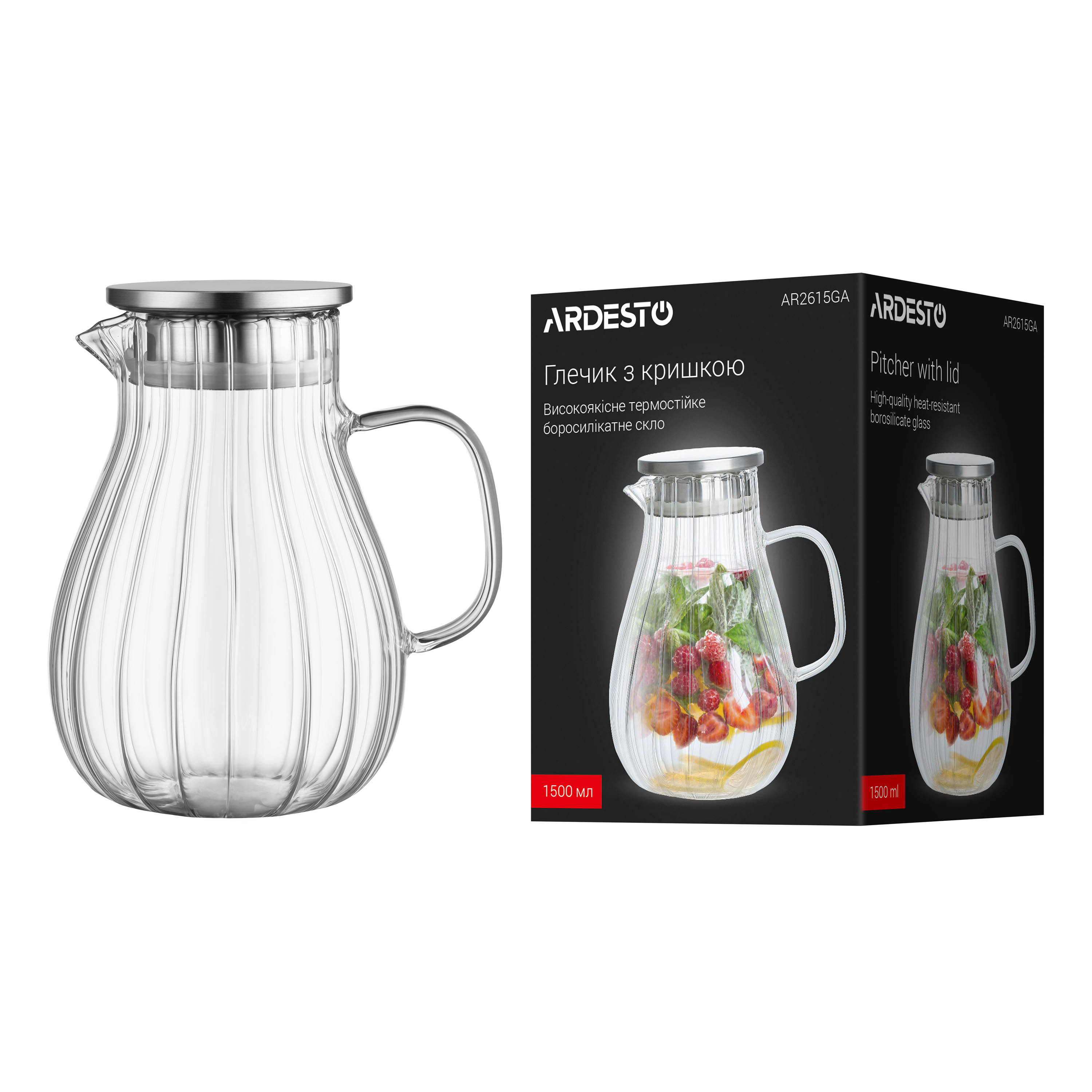 Прозорий глечик ARDESTO є універсальним виробом, який стане окрасою як святкового, так і повсякденного столу. Витончена форма у поєднанні зі знімною кришкою з нержавіючої сталі та ручкою з елегантним вигином сподобається поціновувачам мінімалістського дизайну. Завдяки об’єму 1 500 мл згодиться у родинах, де часто приймають гостей, або у офісах. Глечик заввишки 19 см; максимальний діаметр становить 13,5 см. Висока термостійкість становить -20…+150°C і гарантує використання як з гарячими, так і з прохолодними напоями. Виріб можна мити в посудомийній машині без використання агресивних мийних засобів.